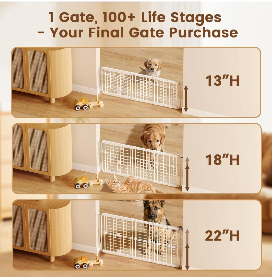 Adjustable dog gate 13-22 inches height; 18-45 inches width extension.