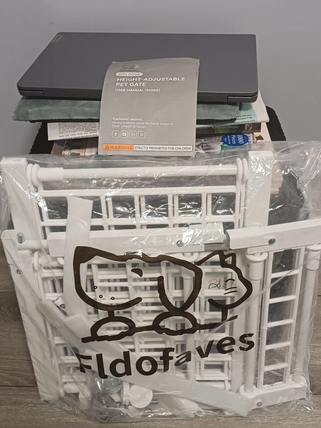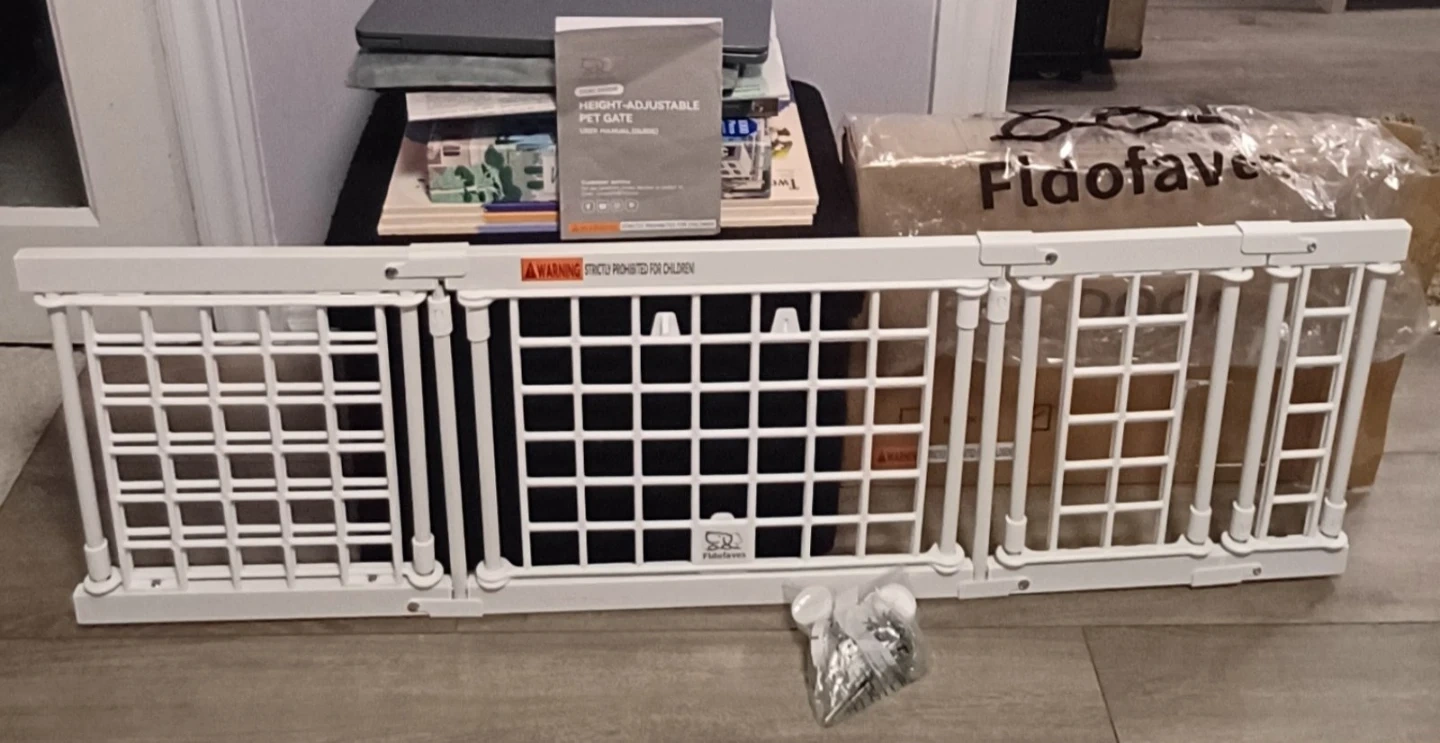 Selling a brand new....Fldofaves height-adjustable pet gate. It's white and looks like it's in great condition! It fits 95% of homes, so no custom orders are needed. It also helps to stop dangerous falls, even for jumping experts!