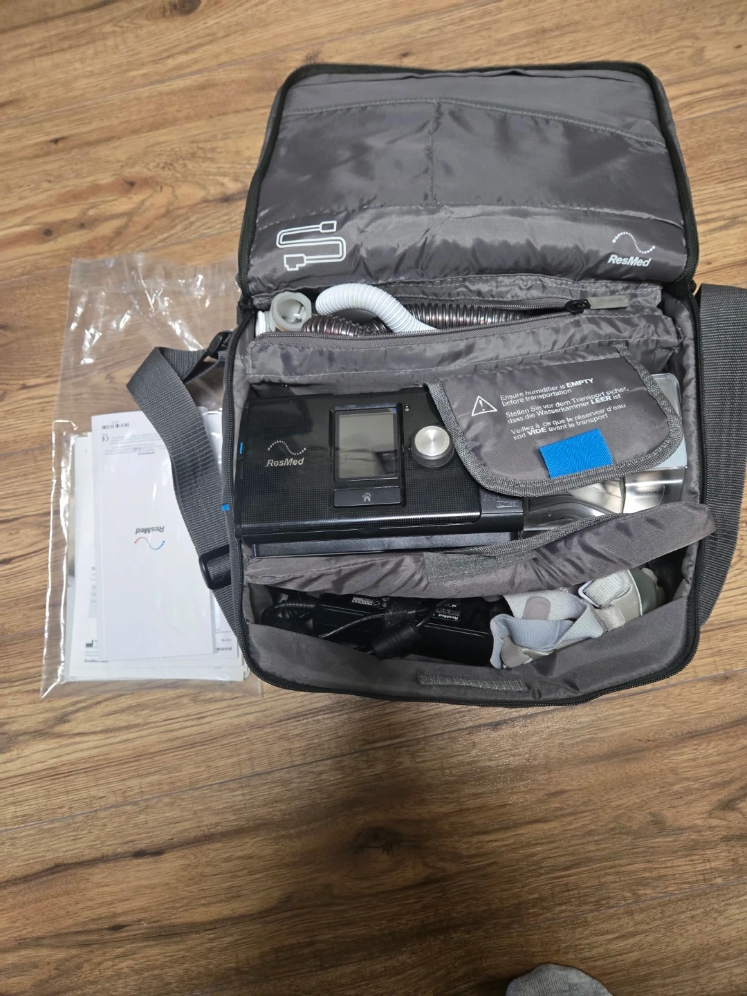 Selling a ResMed CPAP machine with its carrying bag. The bag has compartments for all the accessories. Also included are some manuals and tubing.