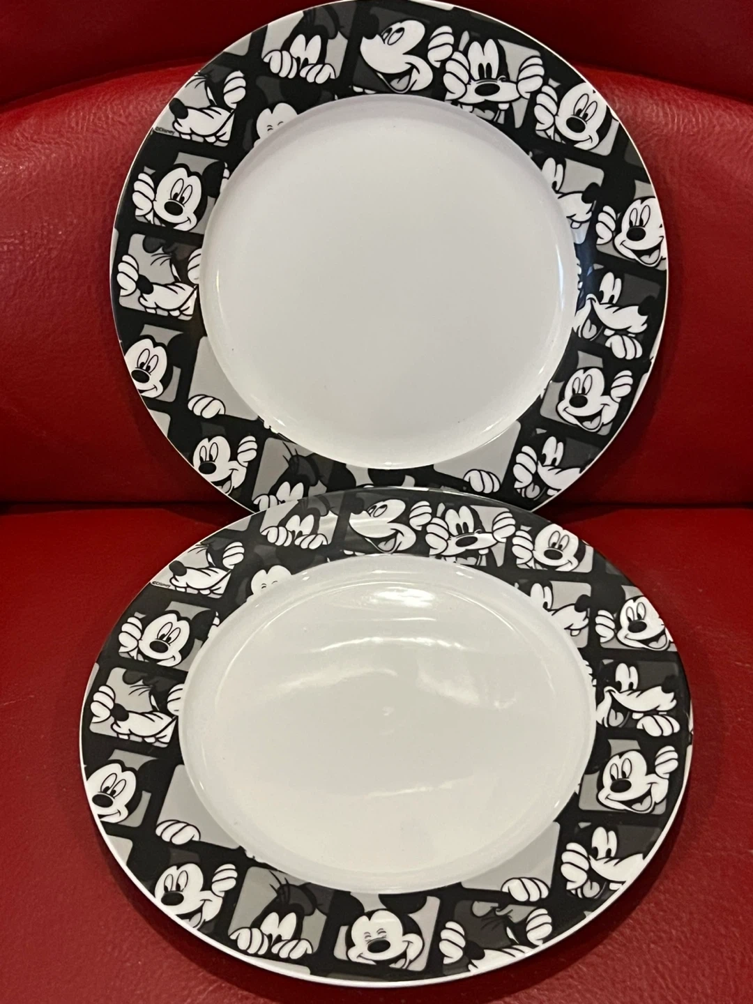 Selling a set of two Disney Mickey Mouse plates! They feature a fun black and white Mickey Mouse design around the edges. Perfect for adding a touch of Disney magic to your table