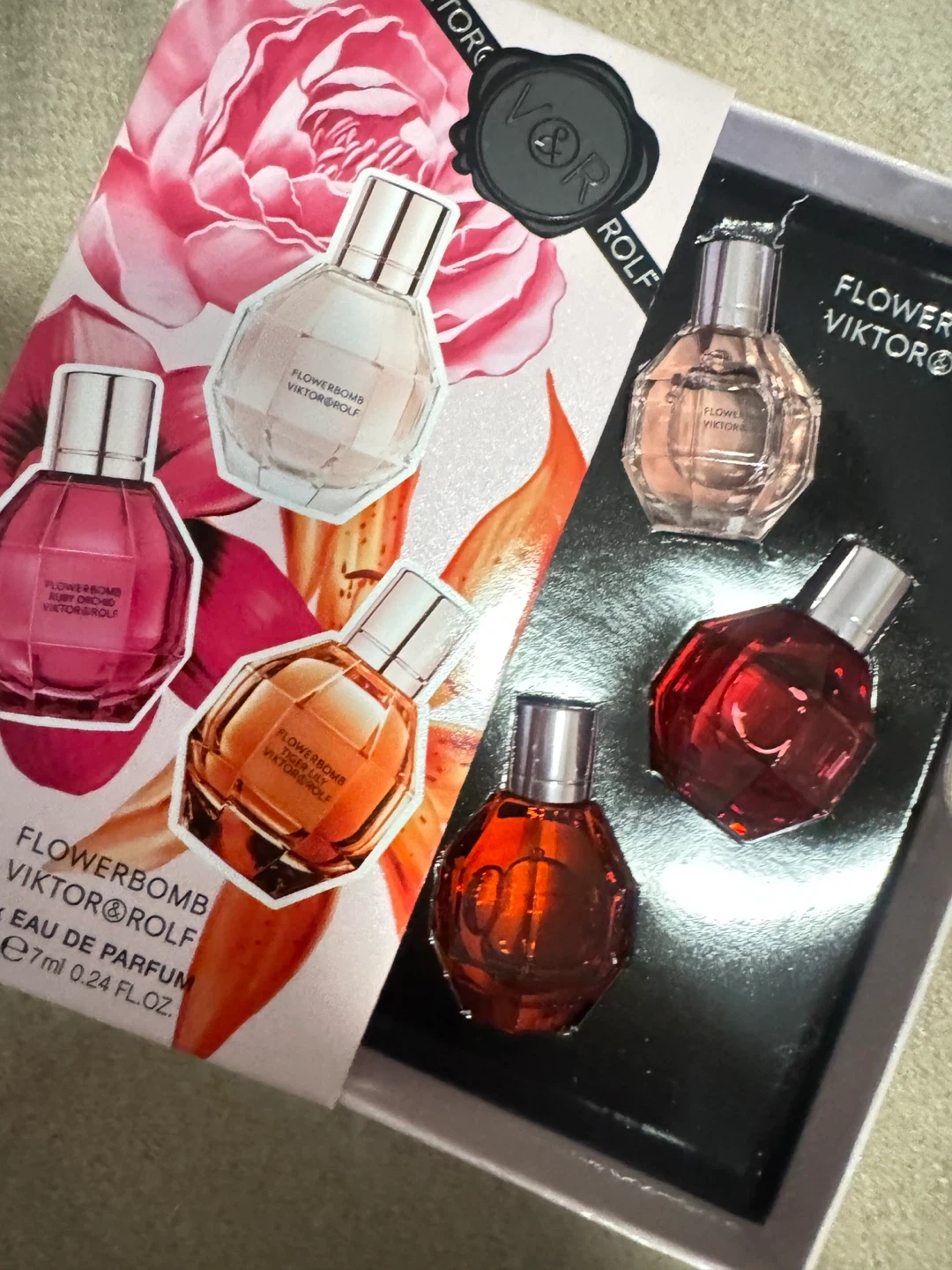 Selling a perfume sampler set featuring Mugler and Viktor&Rolf fragrances. It's a great way to explore different scents and find your favourites! The set includes a variety of miniature perfume bottles, perfect for travel or trying out new fragrances.