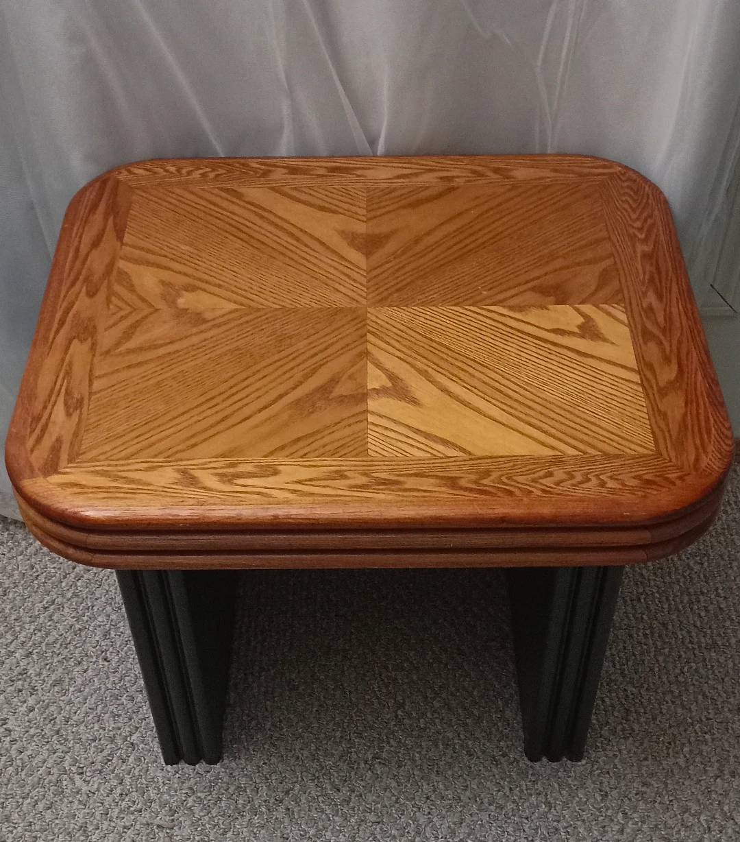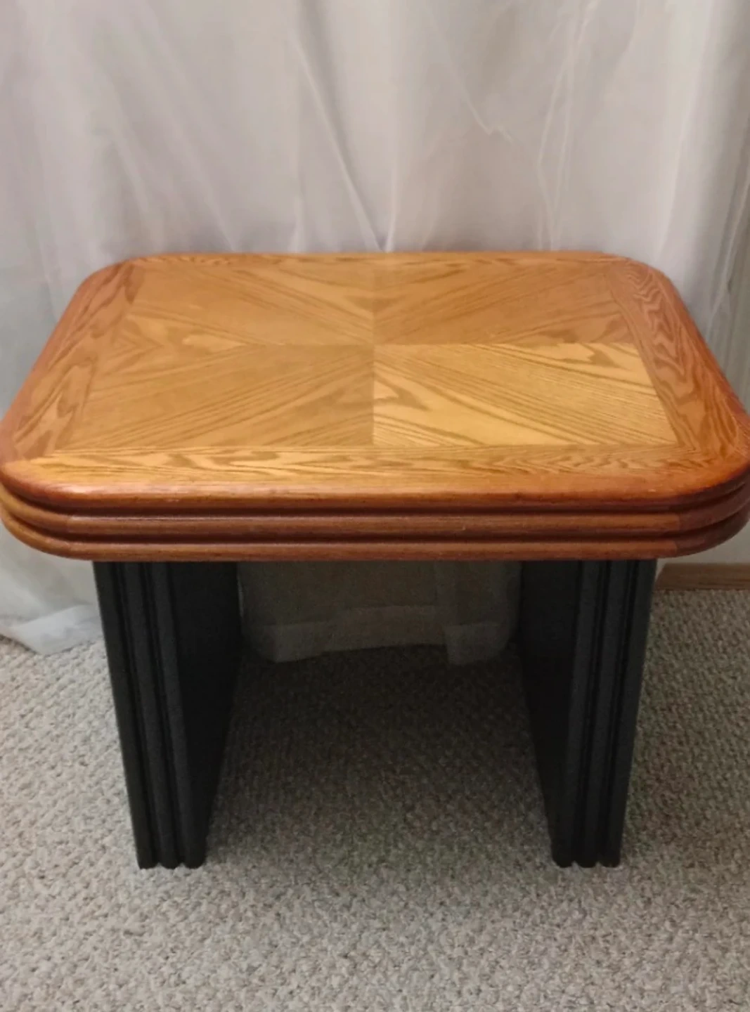 Selling a solid wood end table with a unique design on top. It's sturdy and in good condition.