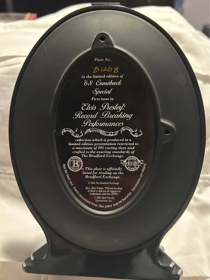 Limited edition Elvis plate with a figure from the ‘68 Comeback Special. This was a record breaking performance and was the 1st issue. I am also selling the 3rd and 2nd issues. They are $75 each and if you but all 3 I will sell them for $200. So you save $25.