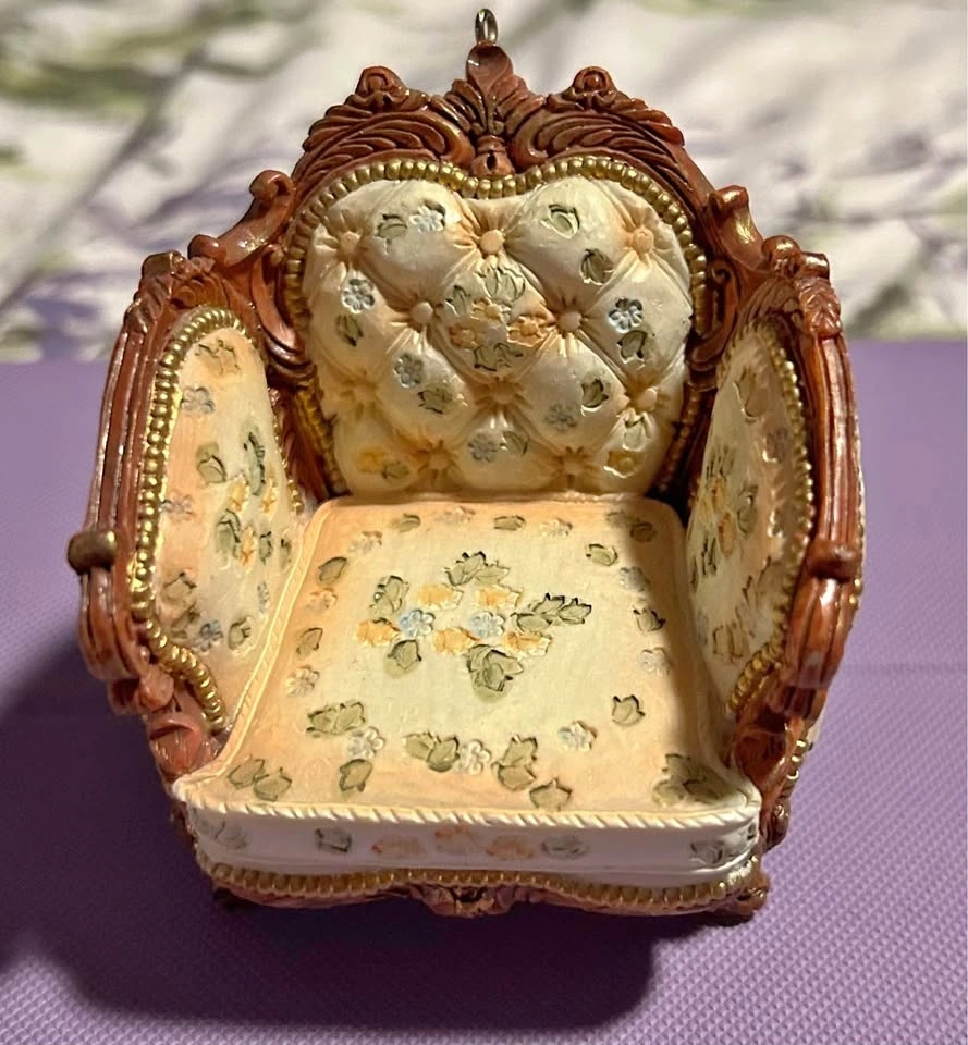 Little miniature chair which is another one of miniature collection. Can be used as display or great for a little girl. It is just over 2 inches high in back and about 2 and 1/2 inches wide. I live in Arbour Lake NW part of city