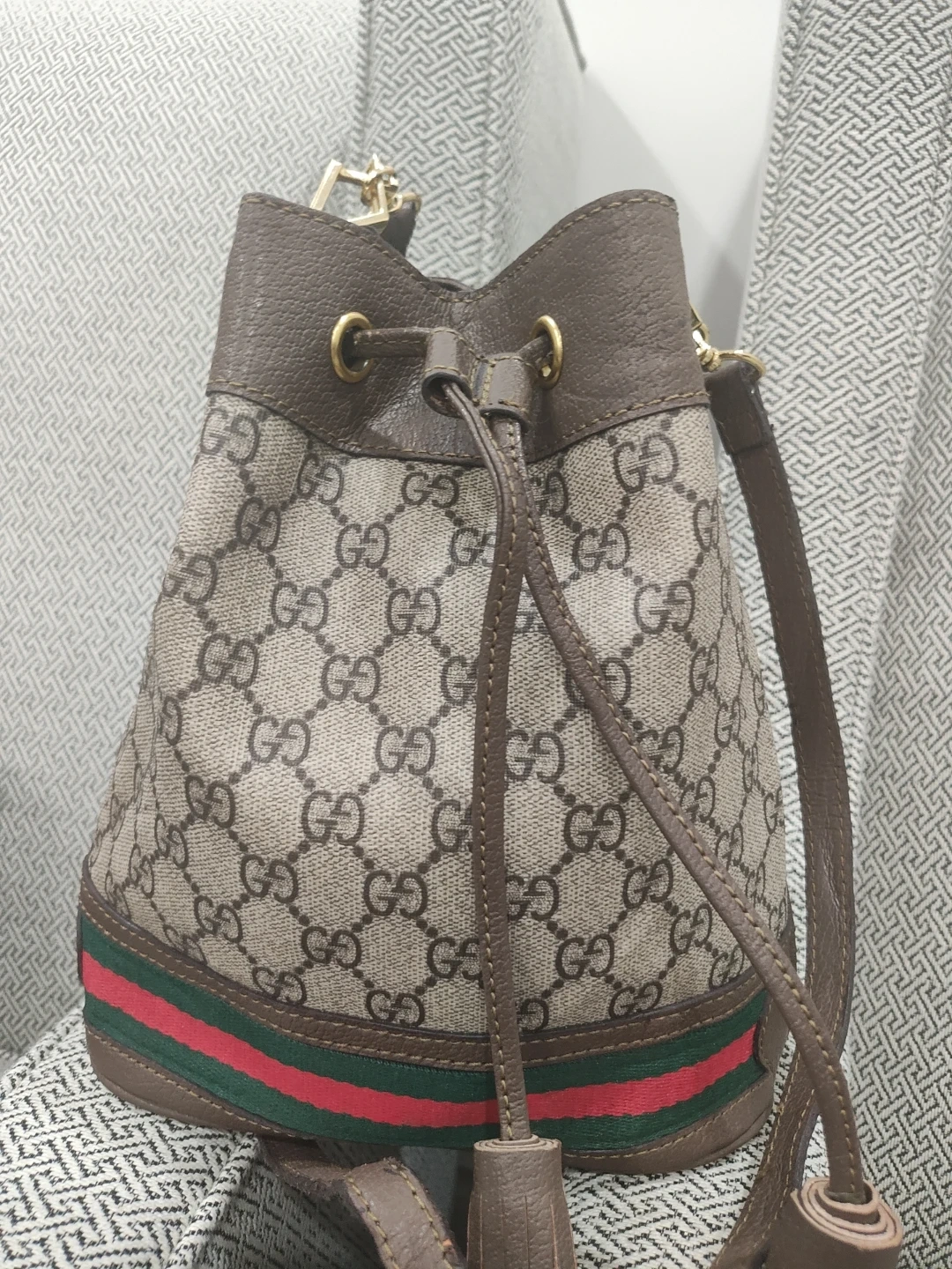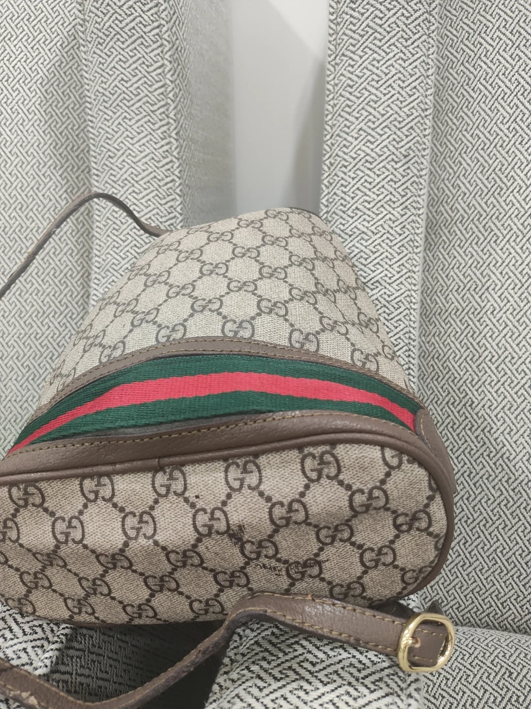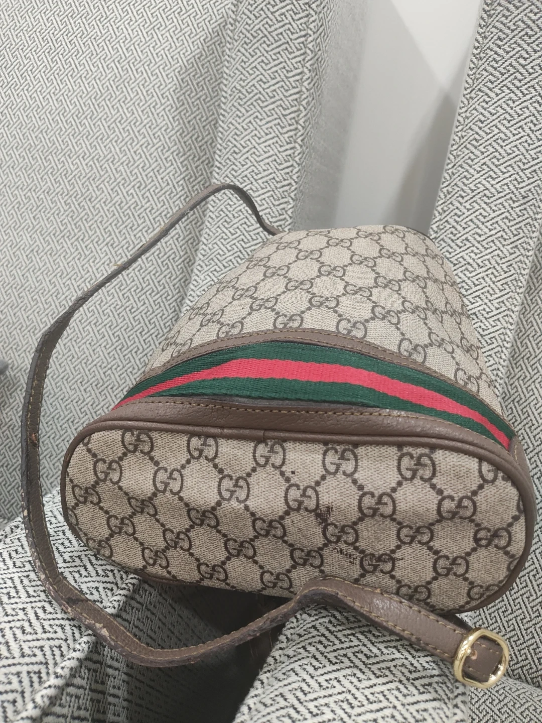 Selling a Gucci bucket bag. It has the classic Gucci monogram pattern with the green and red stripe detail. It's a stylish and functional bag for everyday use!