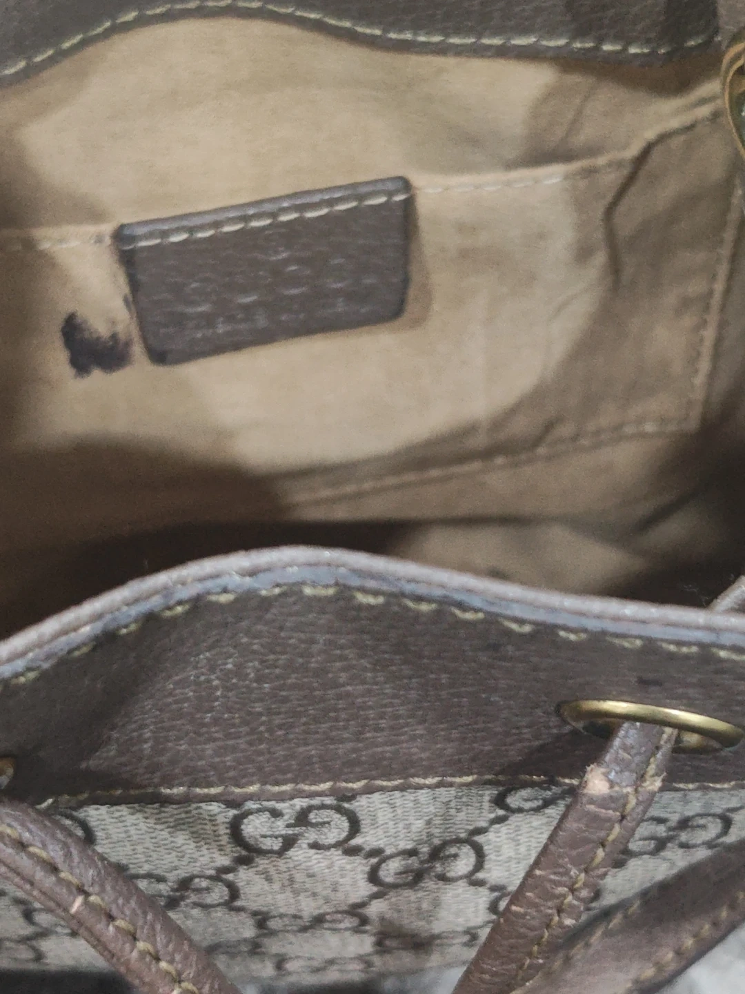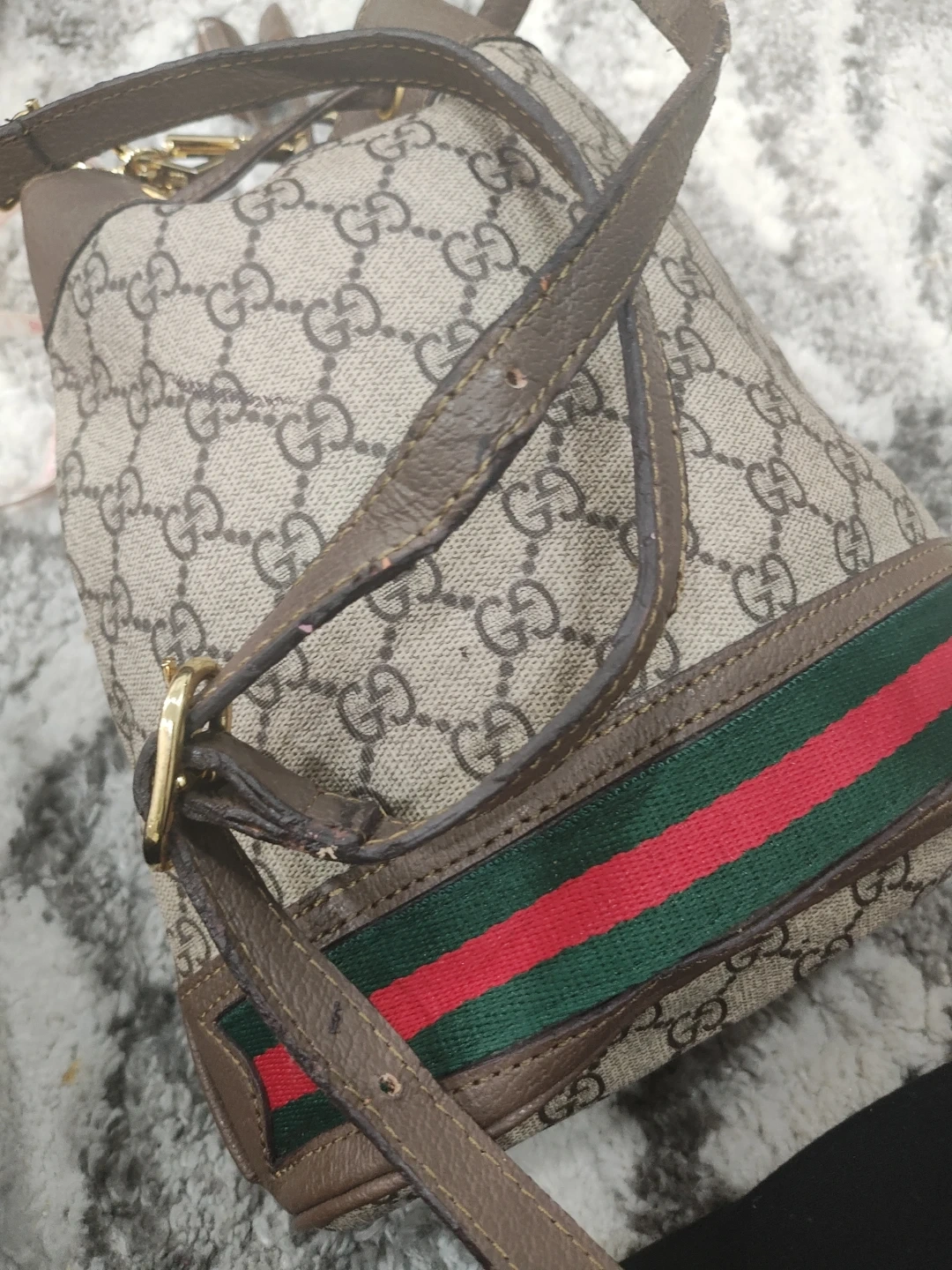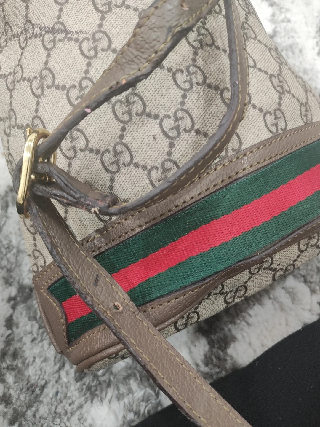 Selling a Gucci bucket bag. It has the classic Gucci monogram pattern with the green and red stripe detail. It's a stylish and functional bag for everyday use!