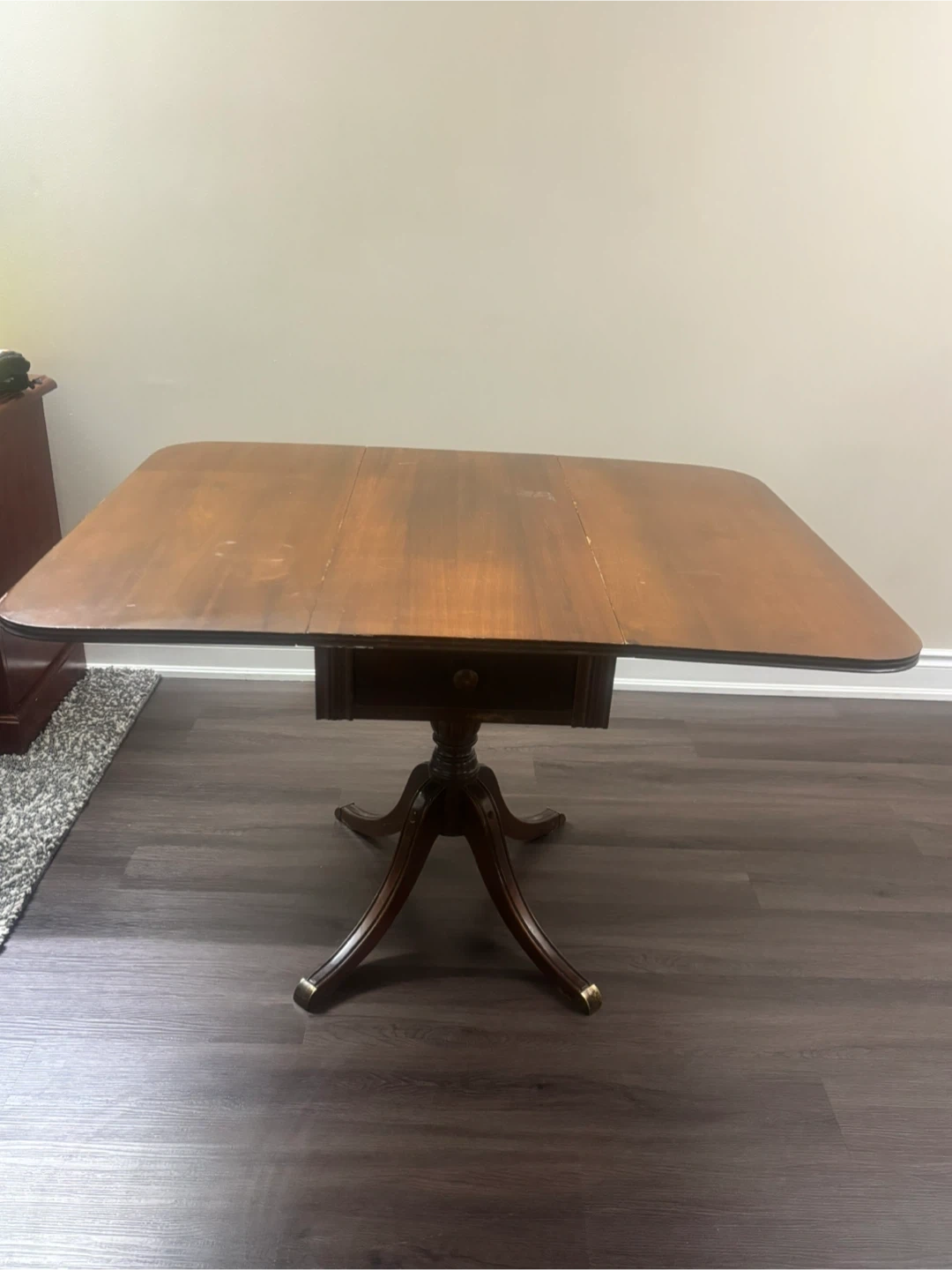 Selling a vintage drop leaf table. It's made of wood and has a warm, brown colour. It features a drawer and a pedestal base. There are some signs of wear, but overall it's in good condition