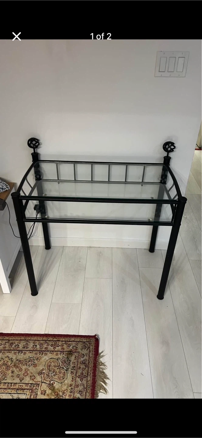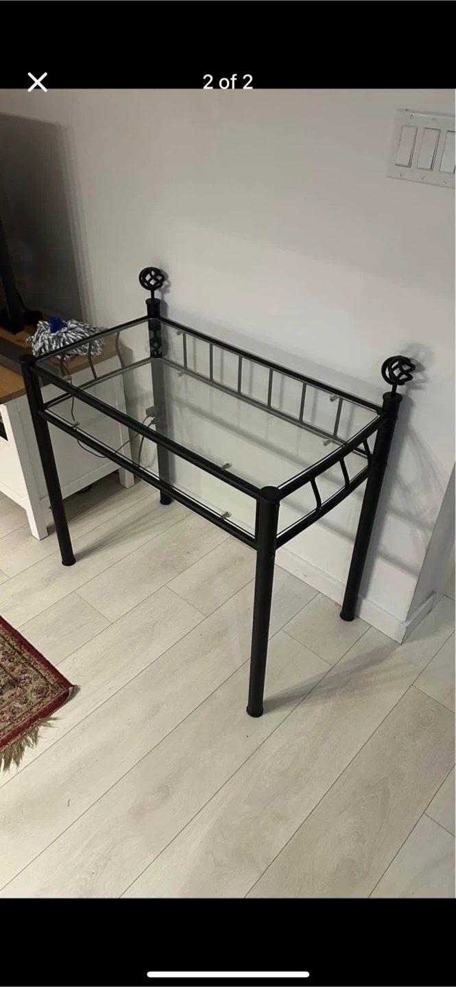 Selling a stylish console table featuring a black metal frame and a glass top. It's in great shape and would look lovely in an entryway or living room. The design has decorative accents on the top corners adding a touch of elegance to any space