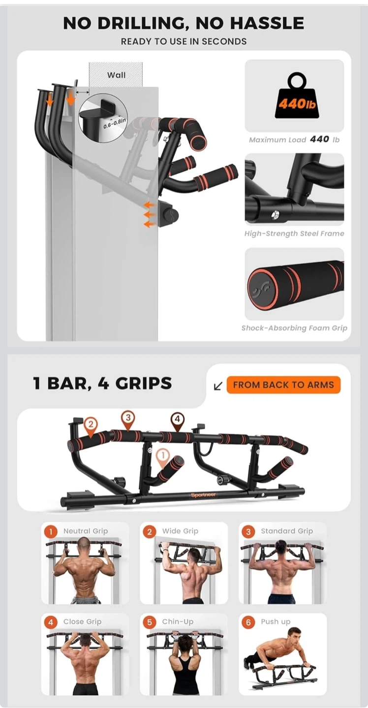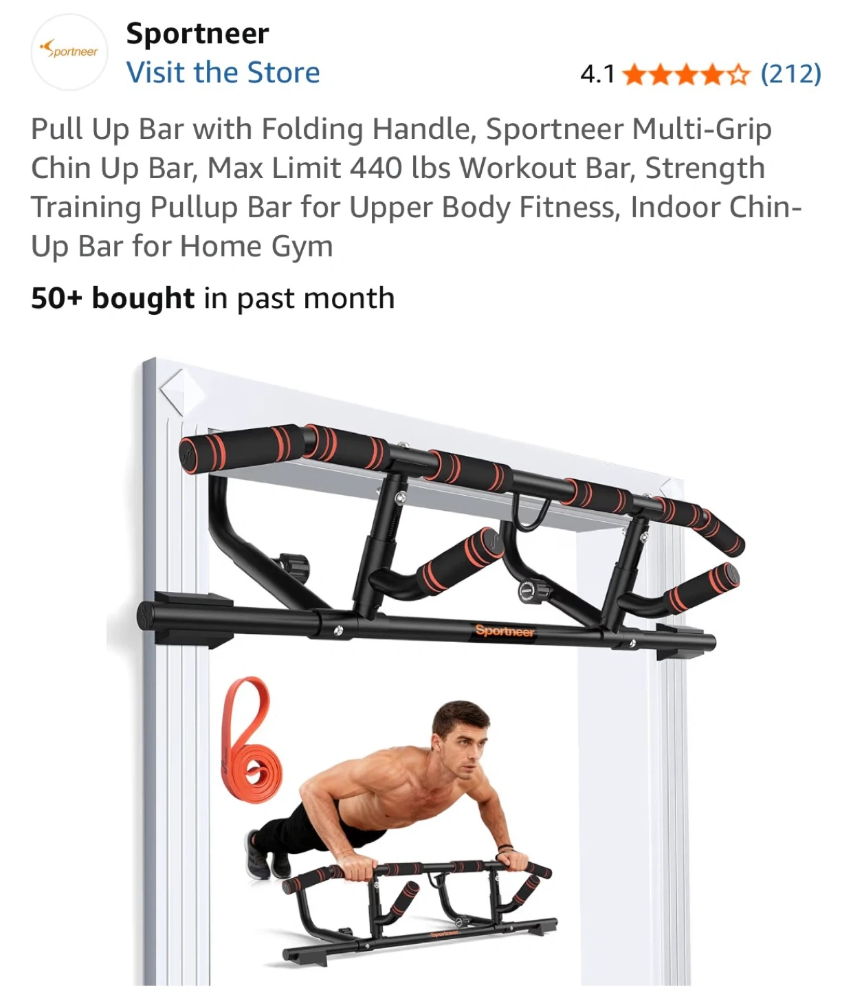 Get your home gym setup going with this Sportneer pull up bar! It features a folding handle and can handle a max limit of 440 lbs. The high-strength steel frame and shock-absorbing foam grips make it a great addition for upper body fitness. It's ready to use in seconds with no drilling needed!