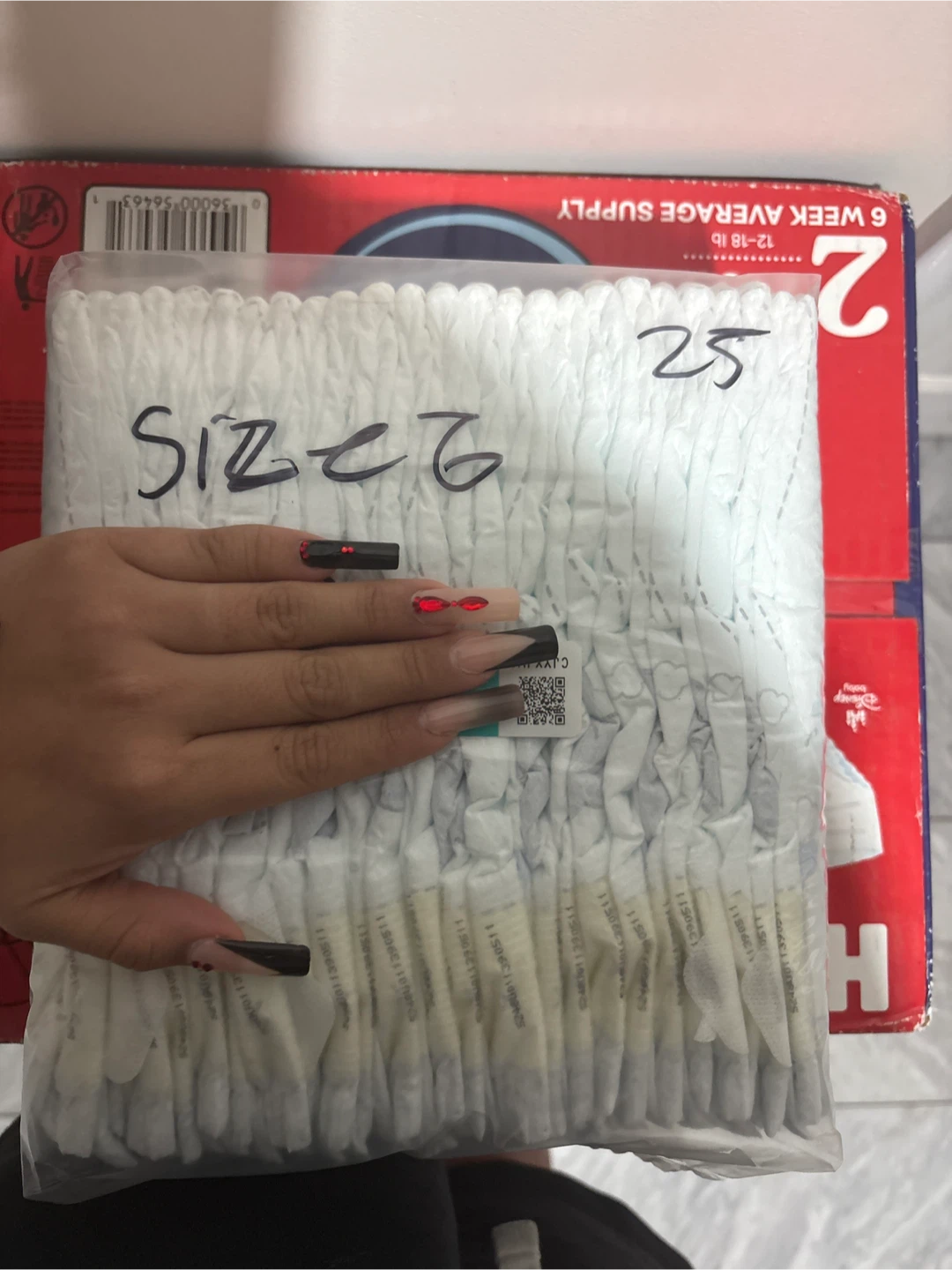 Selling a pack of size 2 diapers! These are designed for babies weighing 12-18 lbs. There are 25 diapers in the pack.