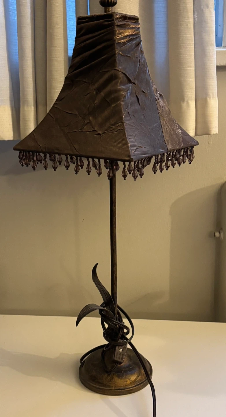 Here's a unique table lamp with a brown, textured shade and beaded trim. The base features a decorative leaf design. It would be a great addition to any room!