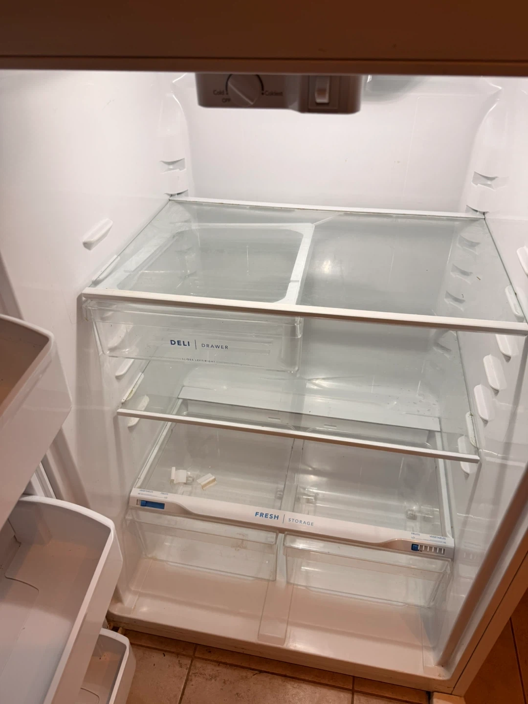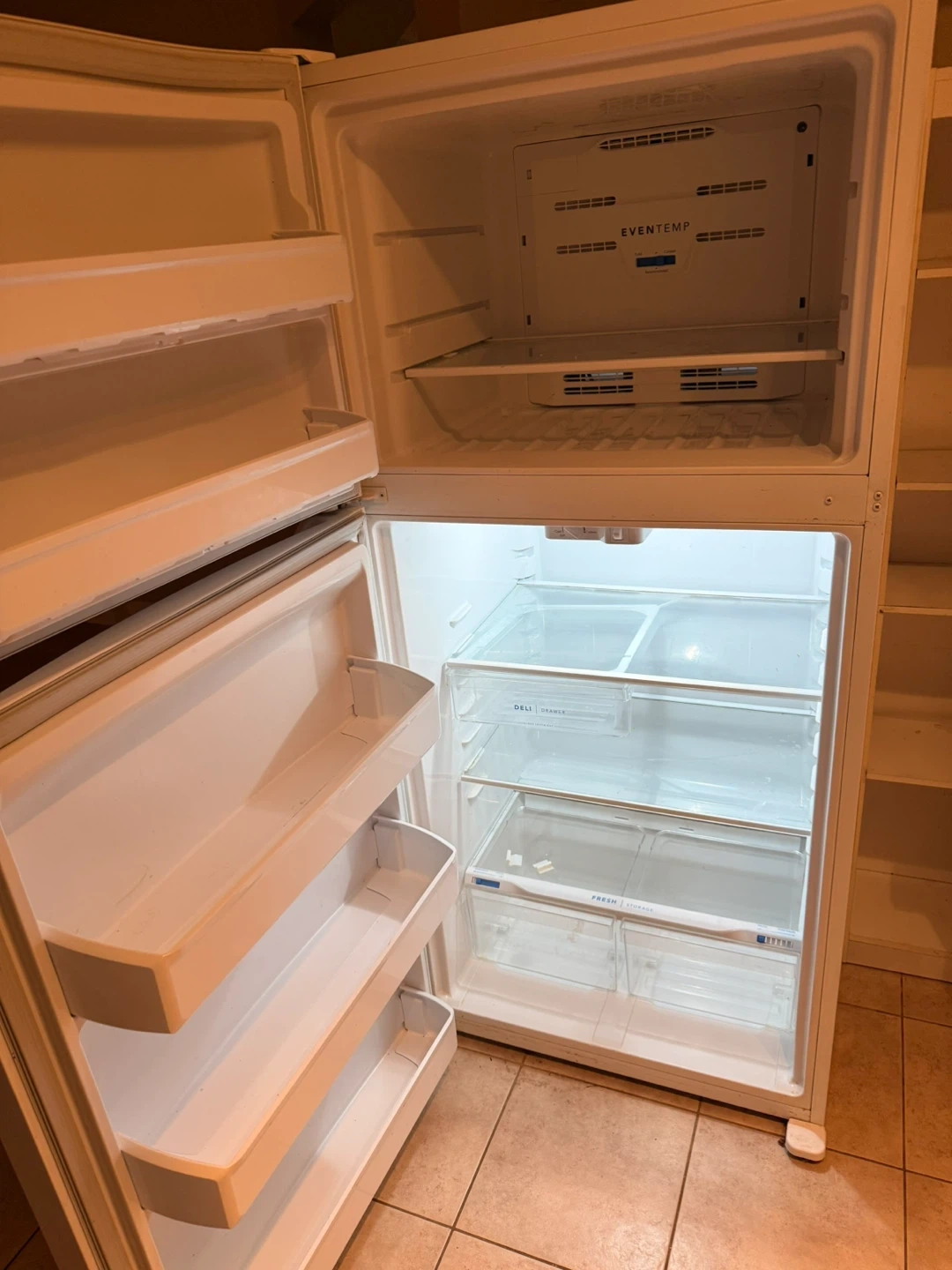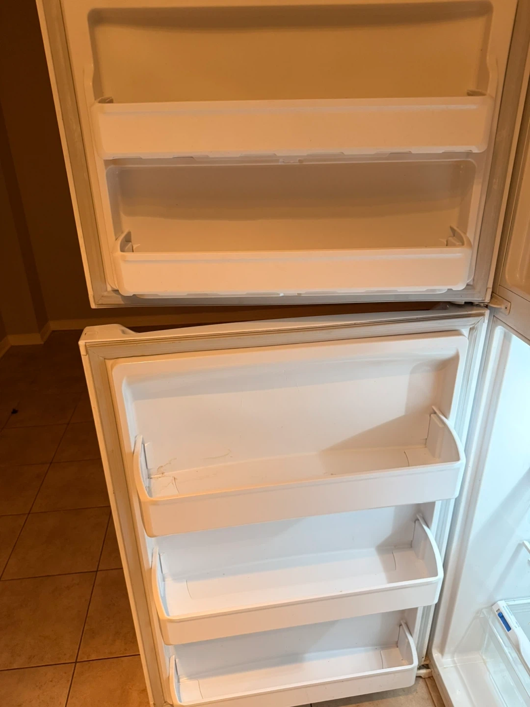 Selling a Frigidaire top-freezer refrigerator in white. It's in good working condition and ready for a new home. Features include adjustable shelves and crisper drawers to keep your food fresh. Perfect for a small family or apartment!