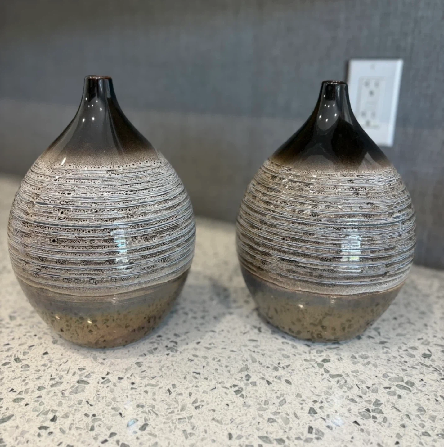 Selling a set of two decorative ceramic vases. They feature a unique textured design with a gradient from dark brown to a lighter, speckled base. These vases would make a lovely addition to any room!