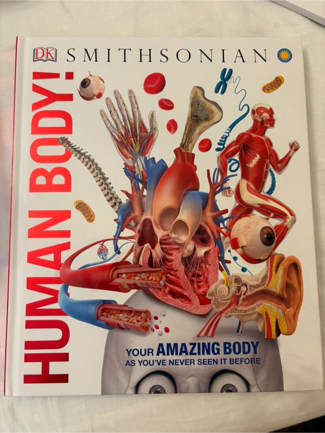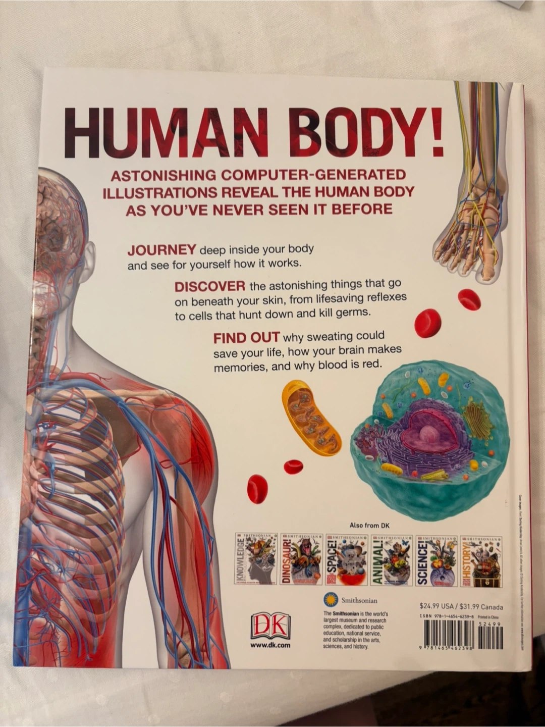 Selling the DK Smithsonian book, Human Body! It contains astonishing computer-generated illustrations to reveal the human body as you've never seen it before. Journey deep inside your body and see for yourself how it works. Discover the astonishing things that go on beneath your skin, from lifesaving reflexes to cells that hunt down and kill germs. Find out why sweating could save your life, how your brain makes memories, and why blood is red