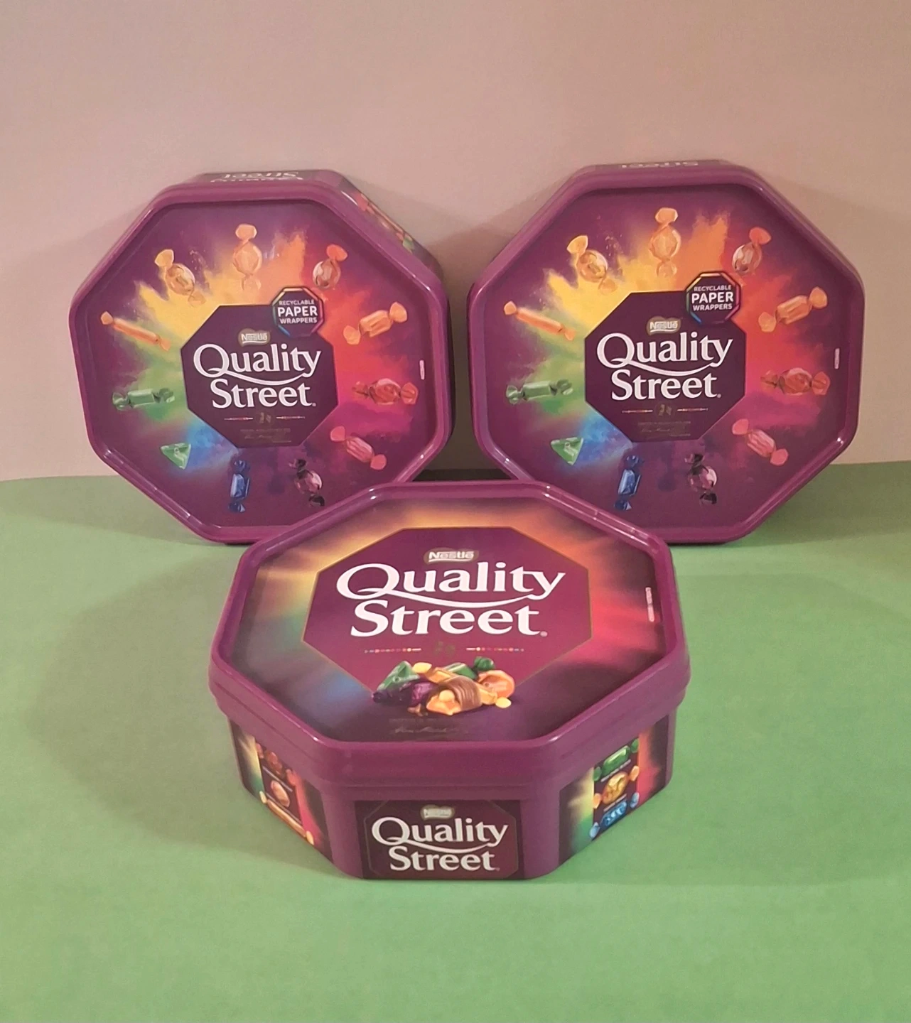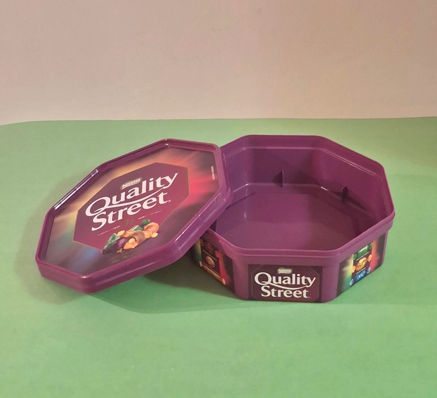 A set of 3 lightly used EMPTY plastic storage containers, suitable for candies, cookies, and knick knacks, for just $10. These lovely collectible octagonal purple Quality Street containers are from the UK.