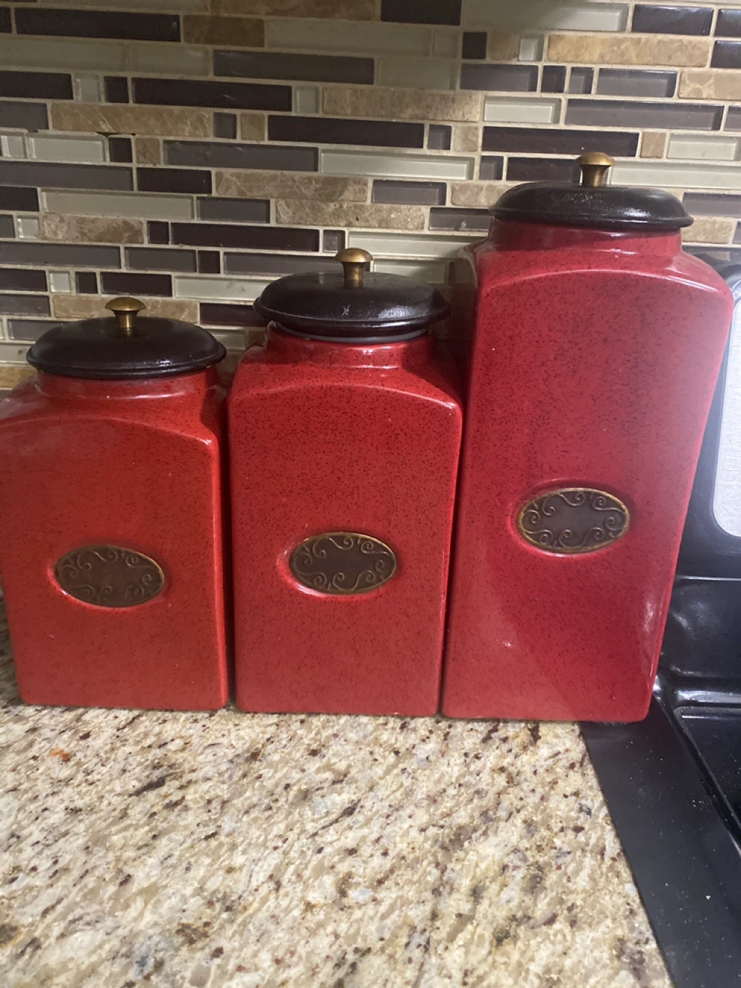 Here's a set of three kitchen canisters in a speckled red finish. They have black lids with gold-tone knobs and decorative oval details on the front. Perfect for adding a pop of colour to your kitchen counter!