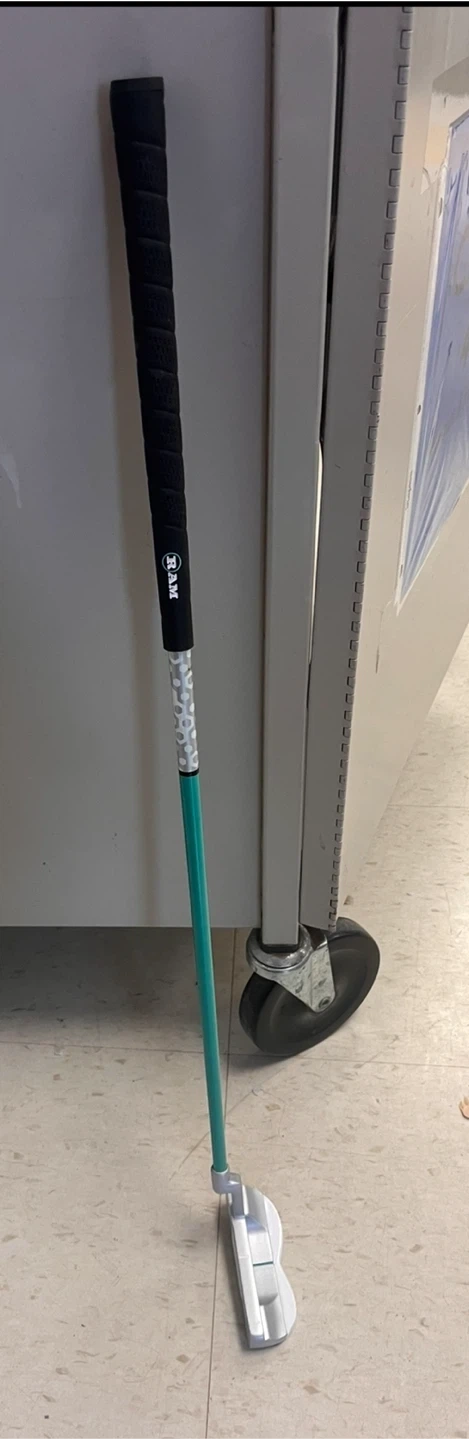 Selling a RAM G-Force putter. It has a black grip and a silver head with green accents. There are some signs of wear on the head, but it's still in good working condition