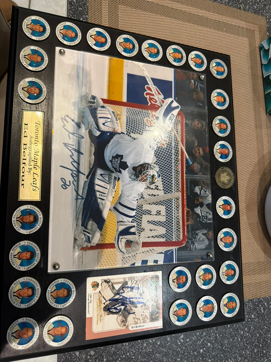 Selling this autographed Ed Belfour plaque. It's a great piece for any Toronto Maple Leafs fan or hockey memorabilia collector! It comes with a certificate of authenticity.