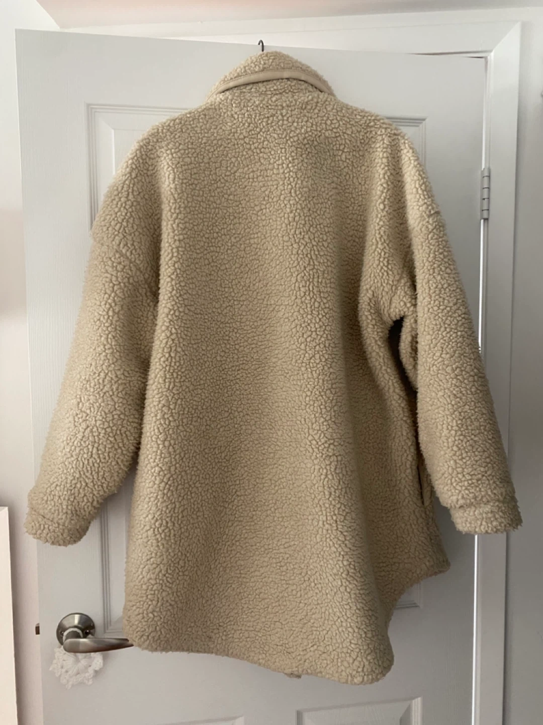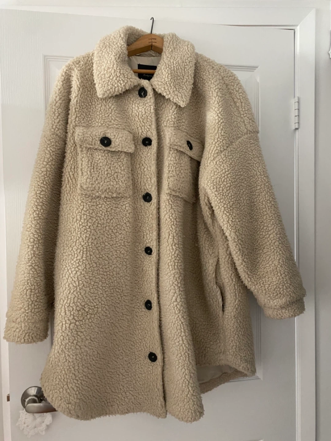 Selling a cozy Bershka teddy coat in a lovely cream colour! It's super soft and perfect for chilly days. The coat features a button-up front and handy pockets. It's in great condition and ready to keep you warm and stylish!