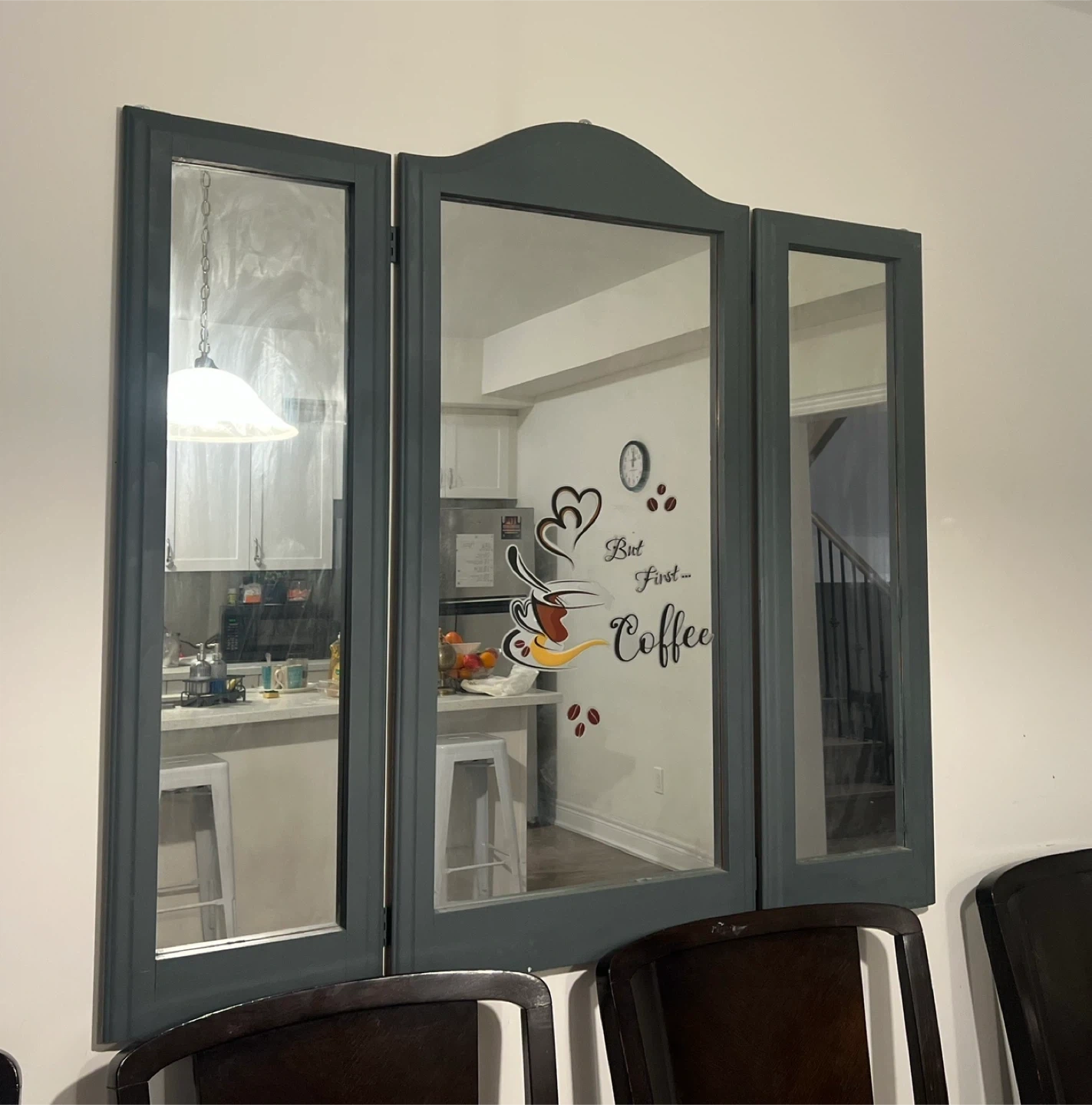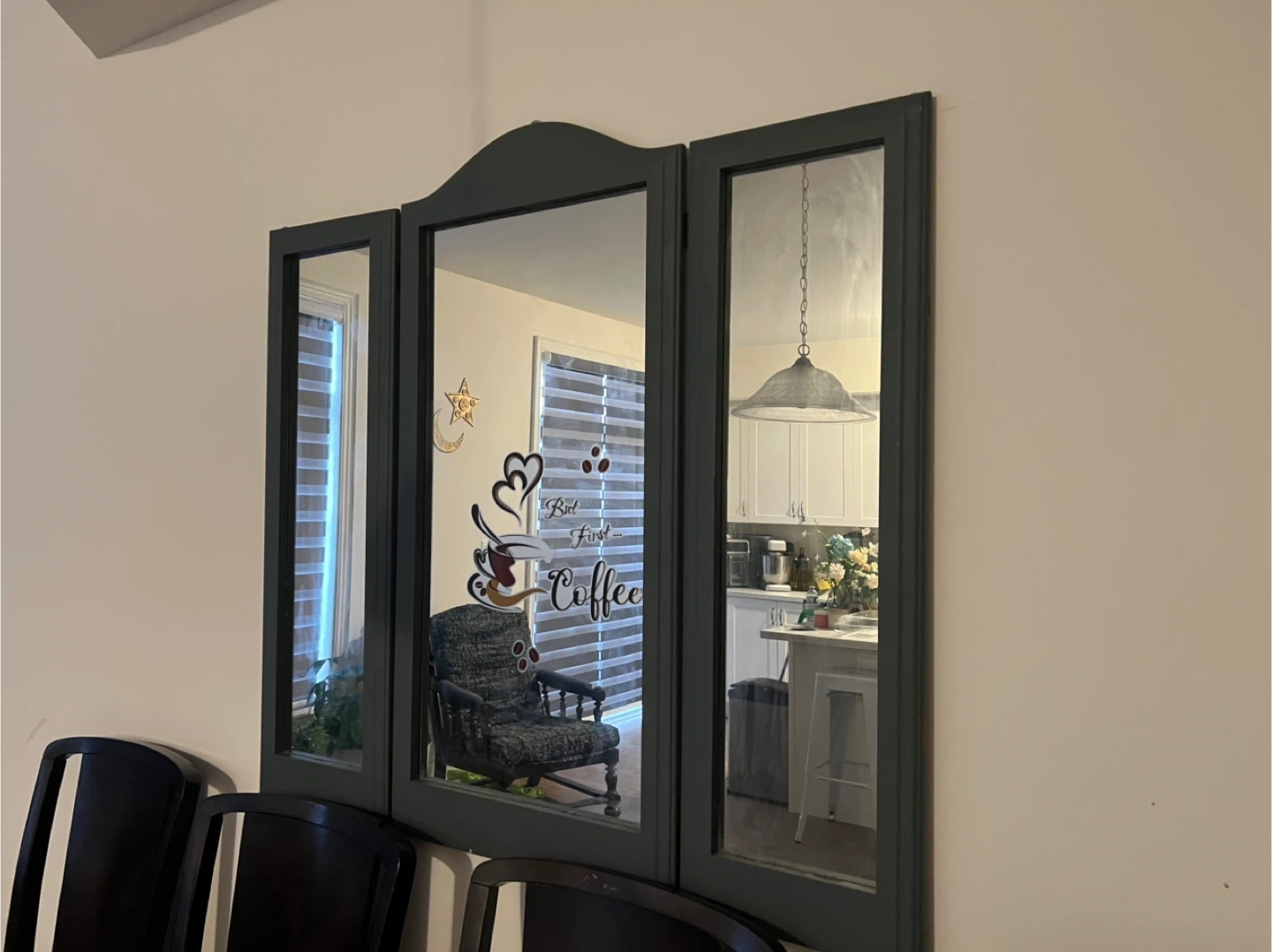 A lovely decorative mirror that would look great in any kitchen or dining area! It features a cute coffee-themed design. The mirror is in great condition and ready to add some charm to your home