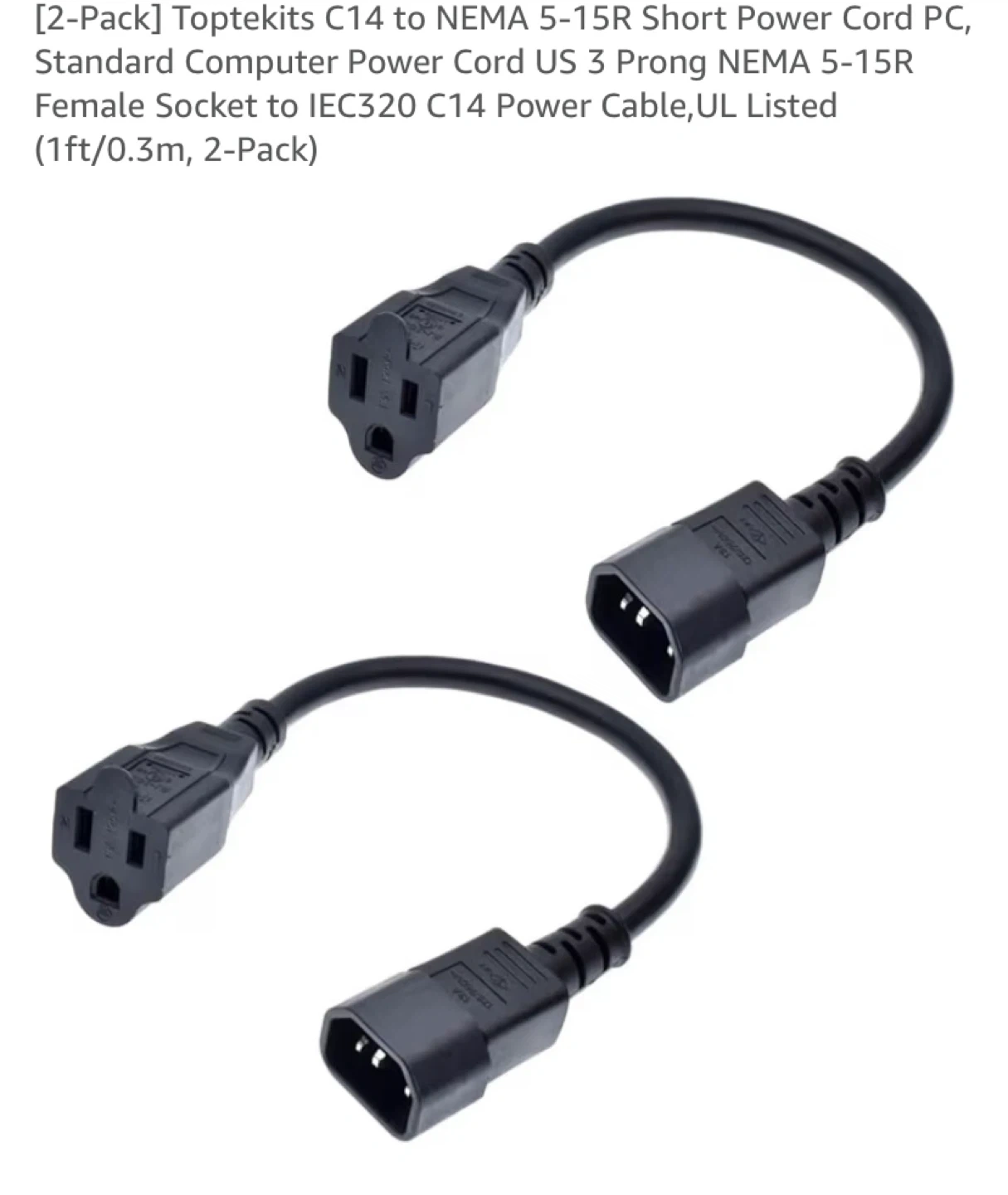 Selling a 2-pack of Toptekits C14 to NEMA 5-15R short power cords. These are standard computer power cords with a US 3-prong NEMA 5-15R female socket to IEC320 C14 power cable. Each cord is 1ft/0.3m long.