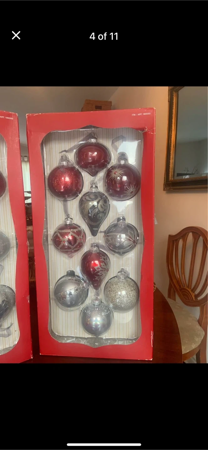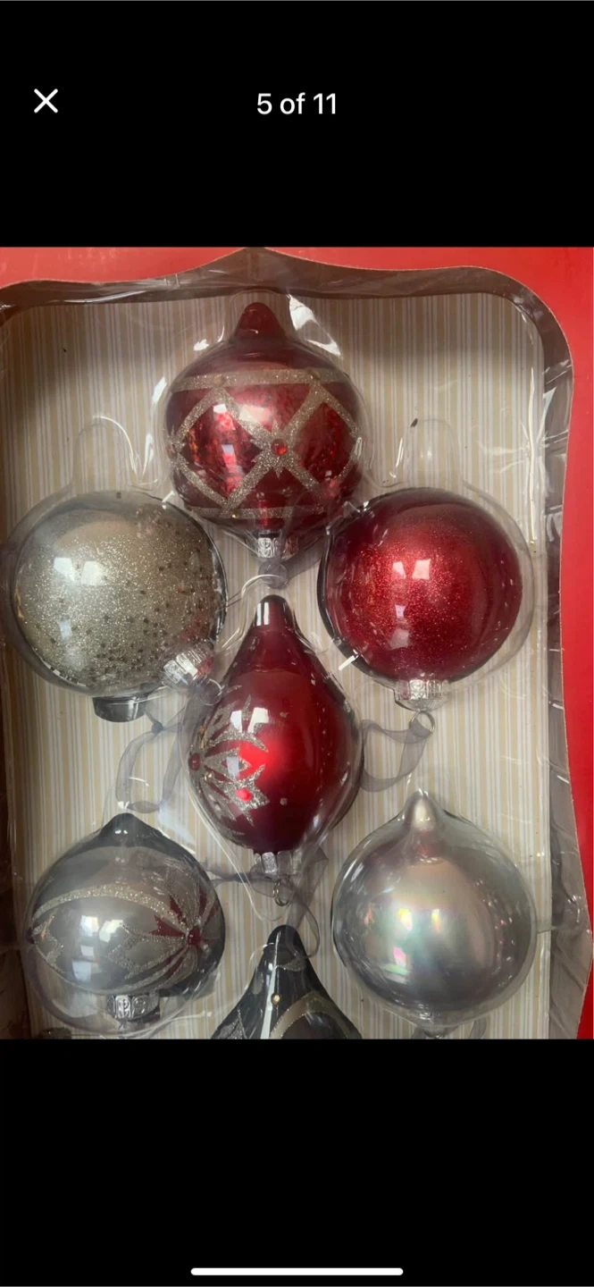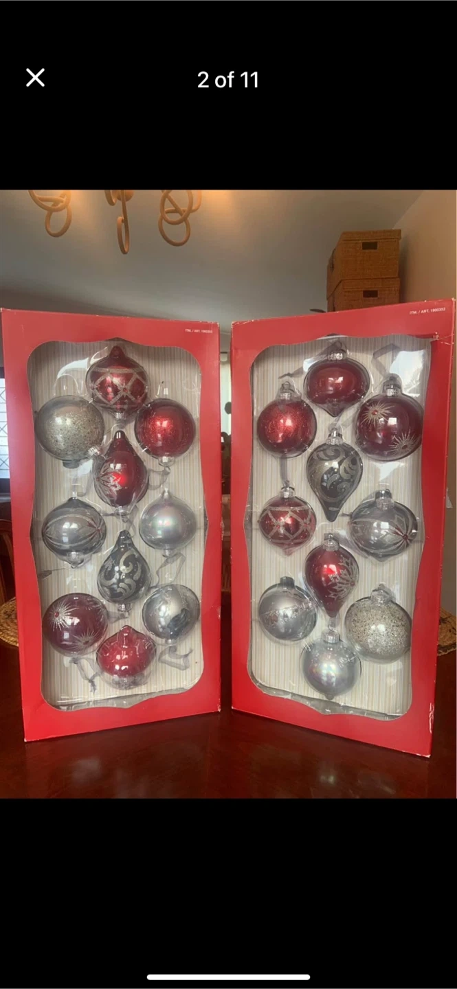 Selling two sets of Christmas ornaments in red and silver colours! Each set comes in its original box and contains 12 ornaments. They're perfect for adding a festive touch to your Christmas tree this holiday season