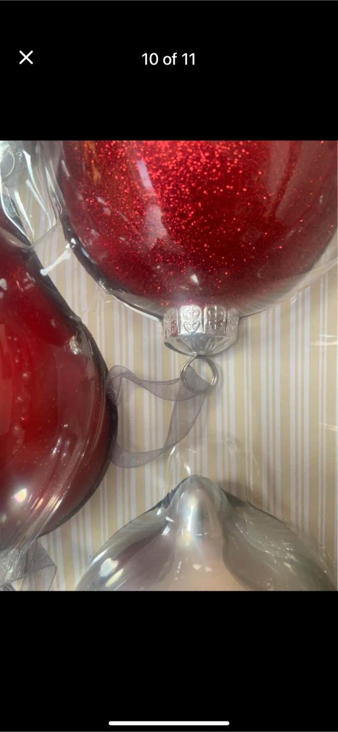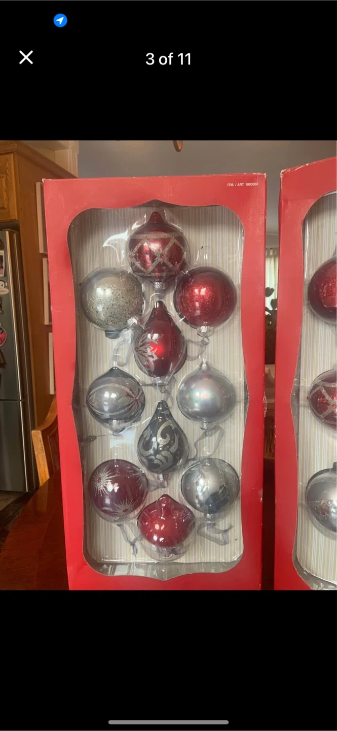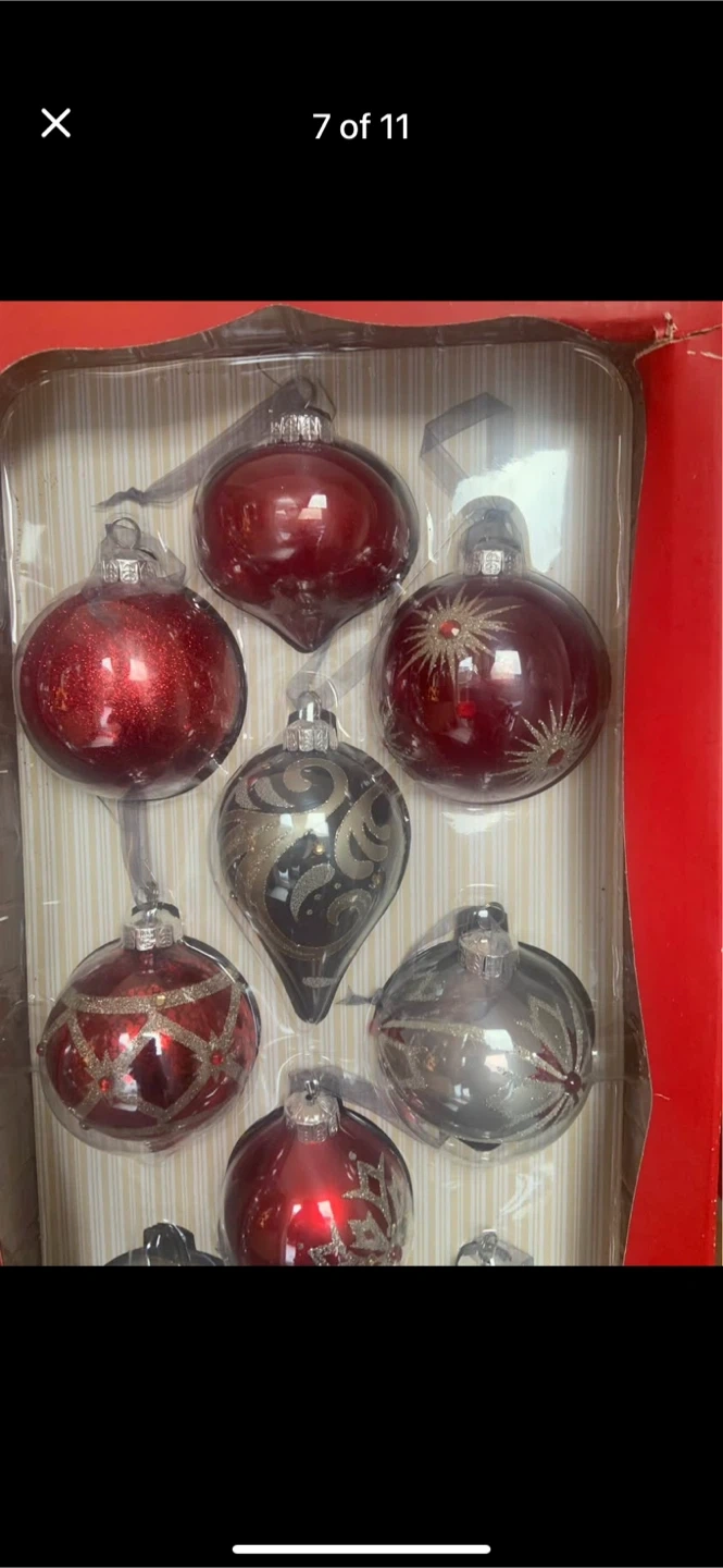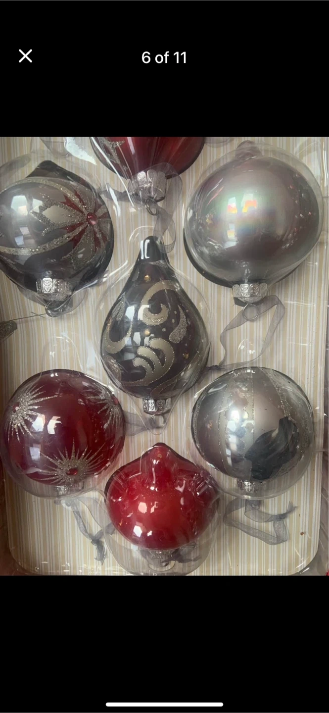 Selling two sets of Christmas ornaments in red and silver colours! Each set comes in its original box and contains 12 ornaments. They're perfect for adding a festive touch to your Christmas tree this holiday season