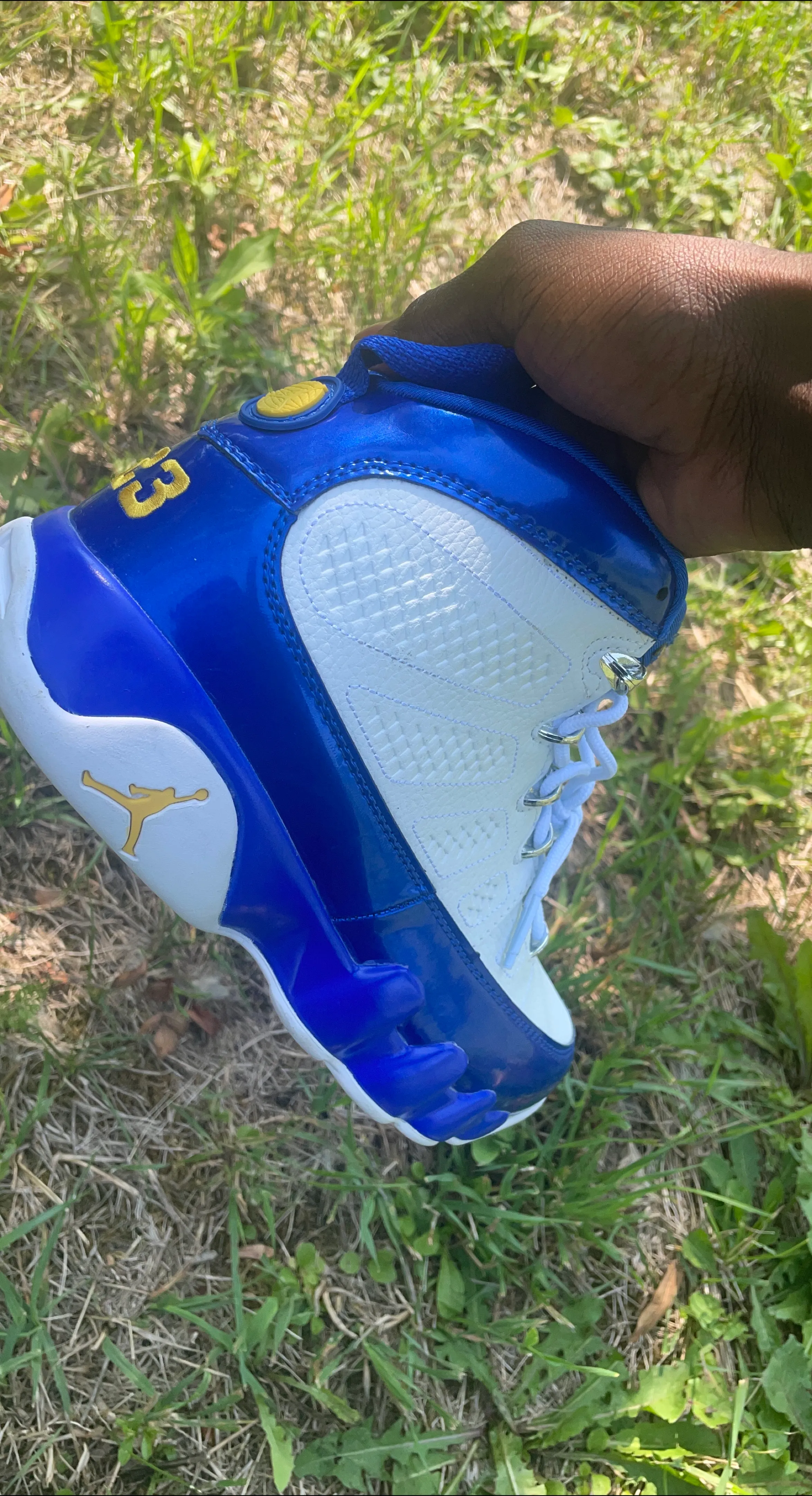 Selling a pair of Jordan 9 Retro sneakers in blue and white. They feature the number 23 on the heel and the Jumpman logo on the side. Great for basketball or casual wear!
