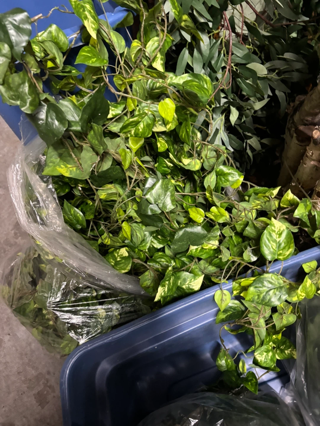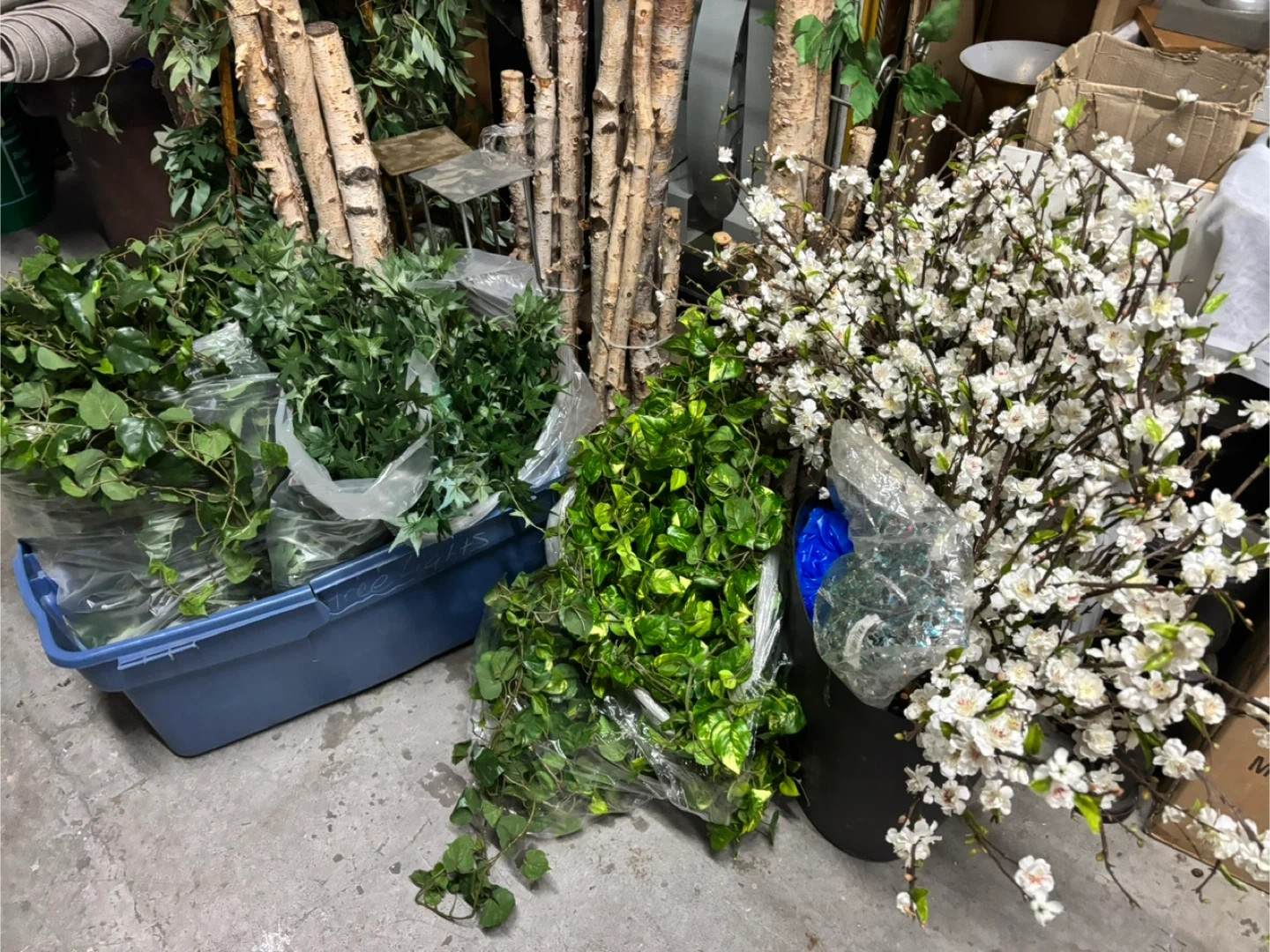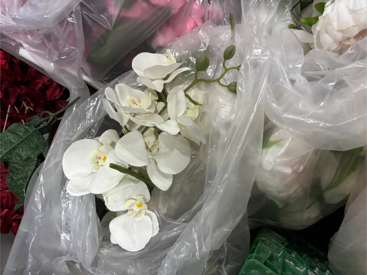 Large bags of silk flowers in pink, white, silver, orange & more.