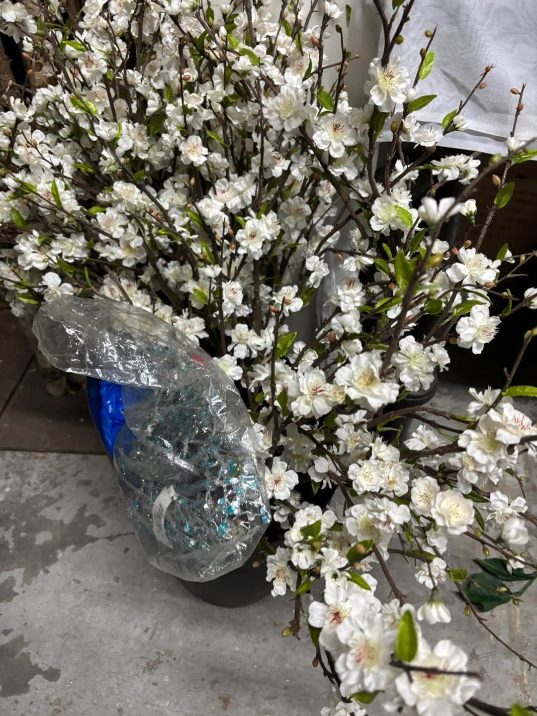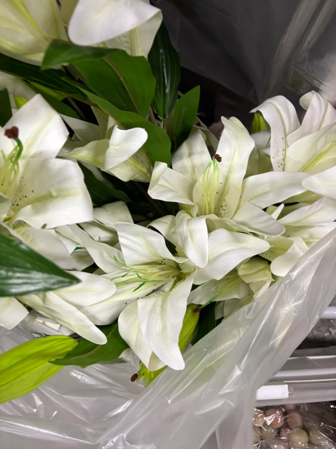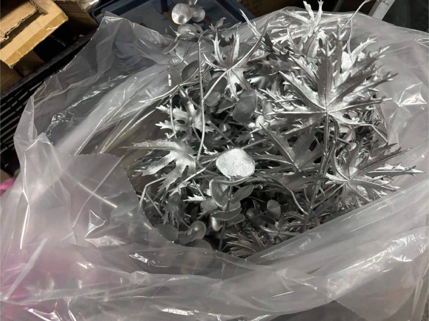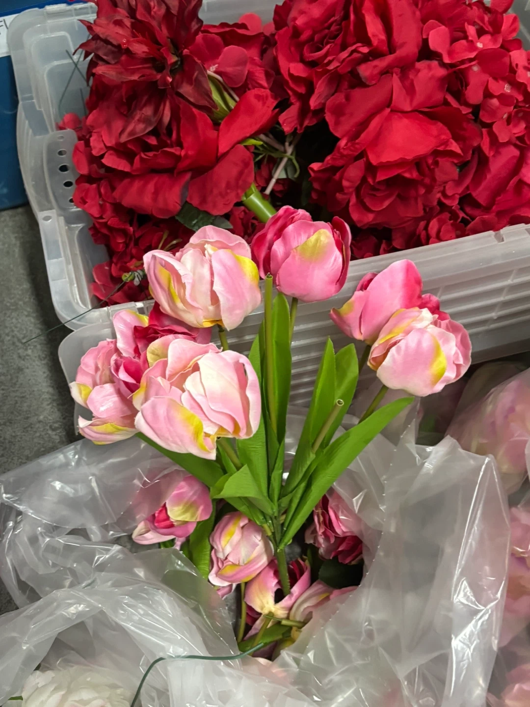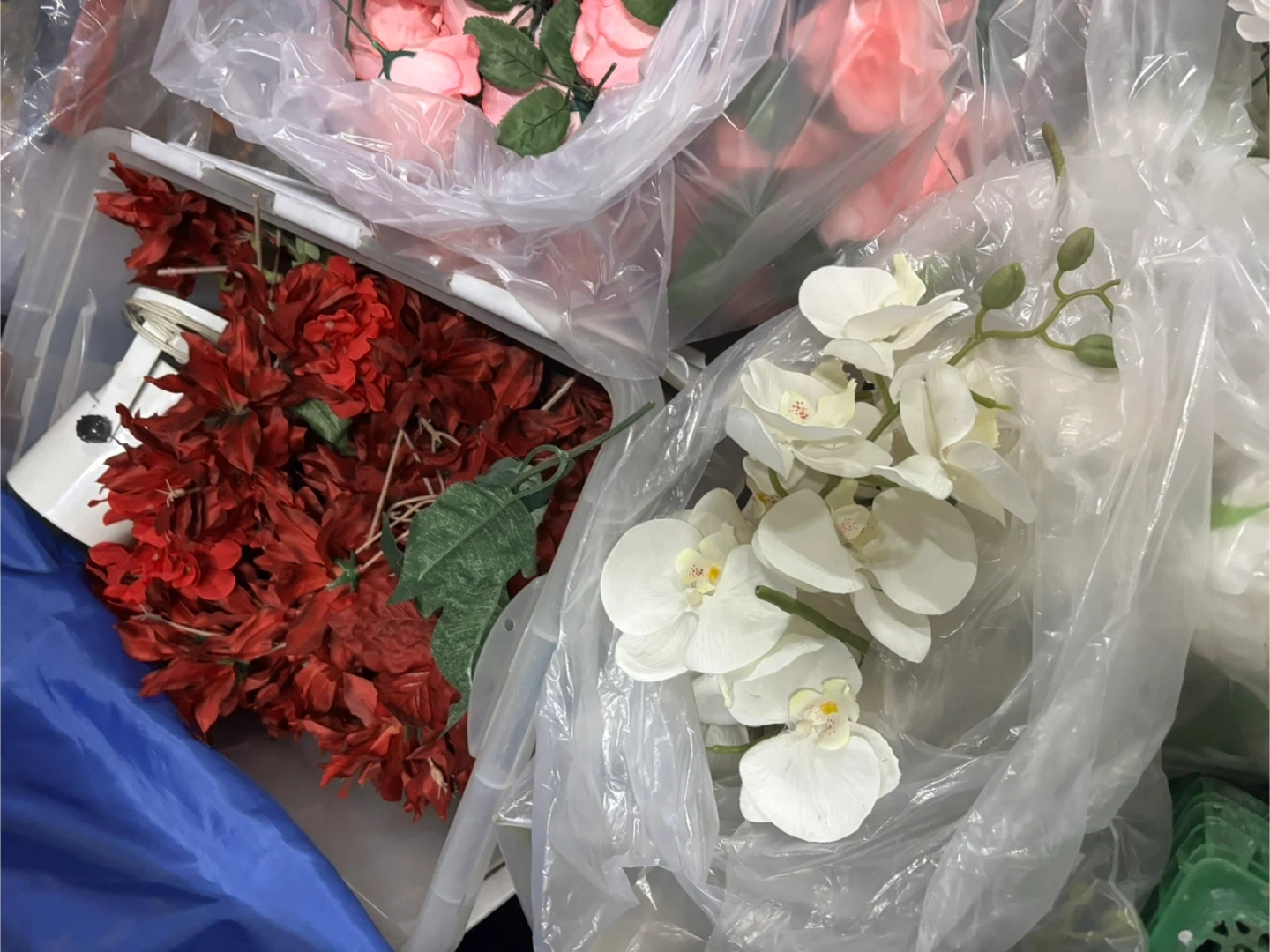 Large bags of silk flowers in pink, white, silver, orange & more.