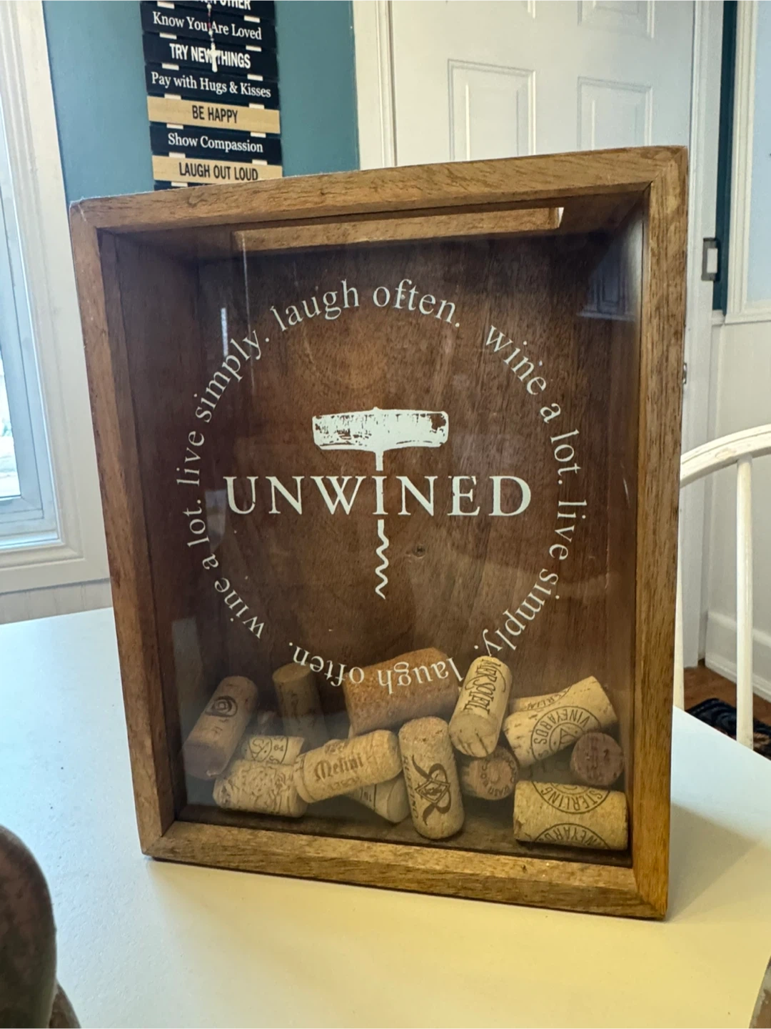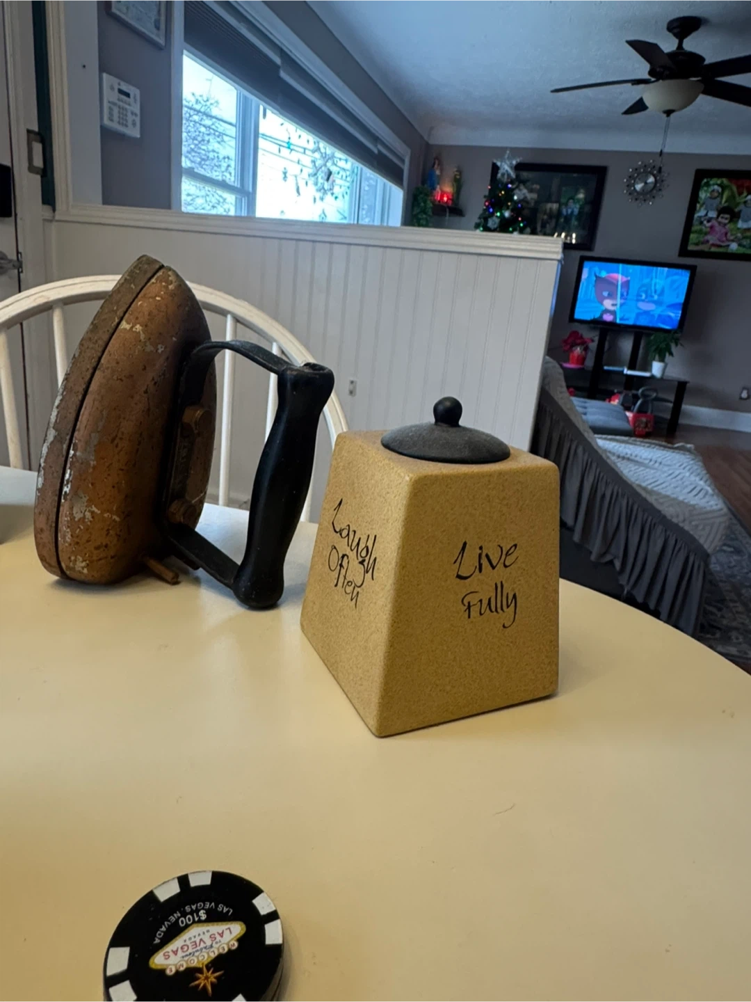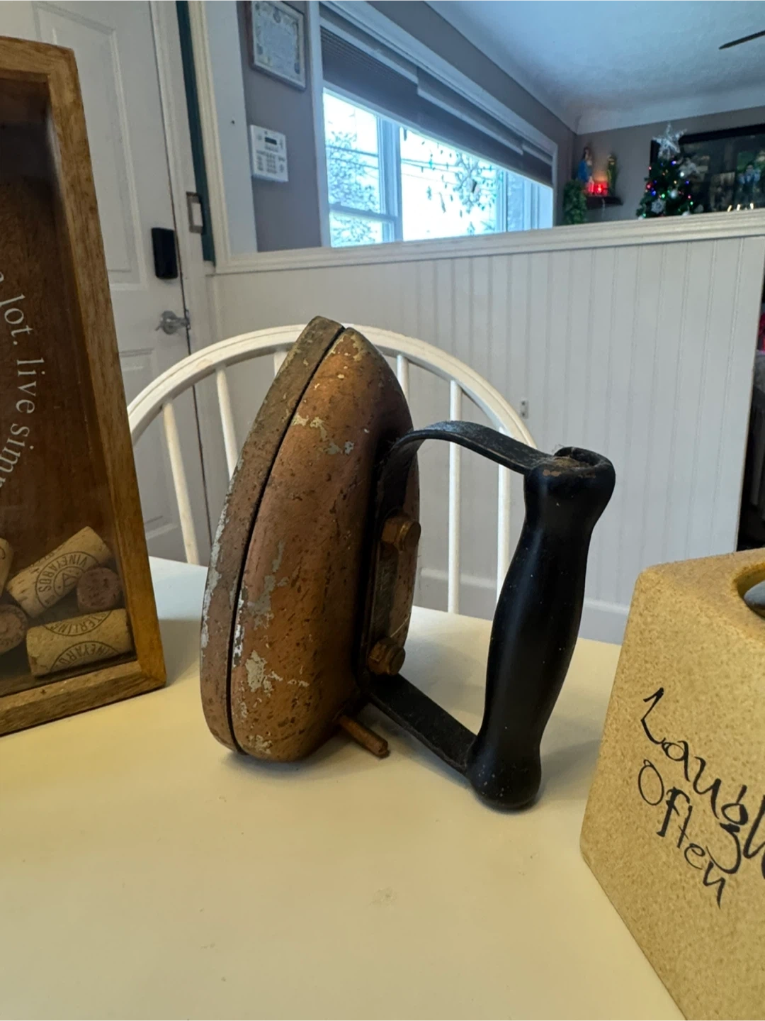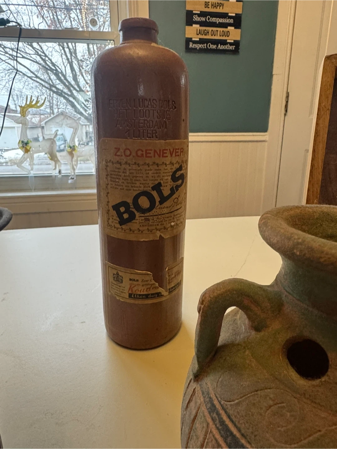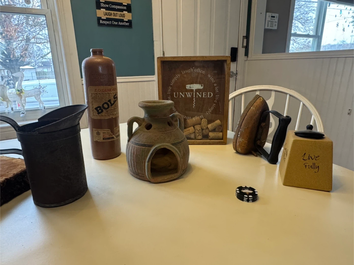 A collection of vintage-style decor items. Includes an antique iron, a Bols Genever bottle, a wine cork display box, and a decorative pot. Perfect for adding a touch of rustic charm to your home!