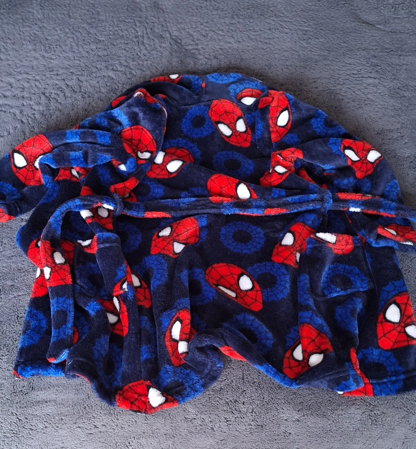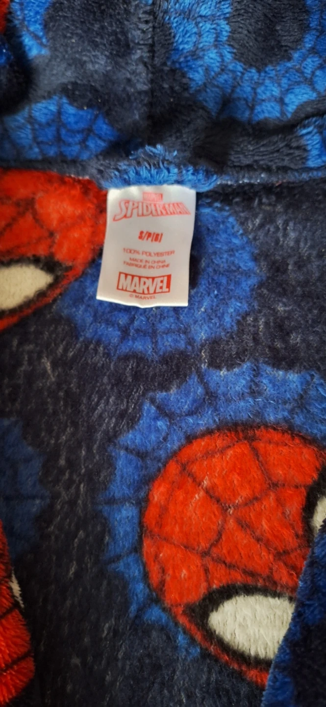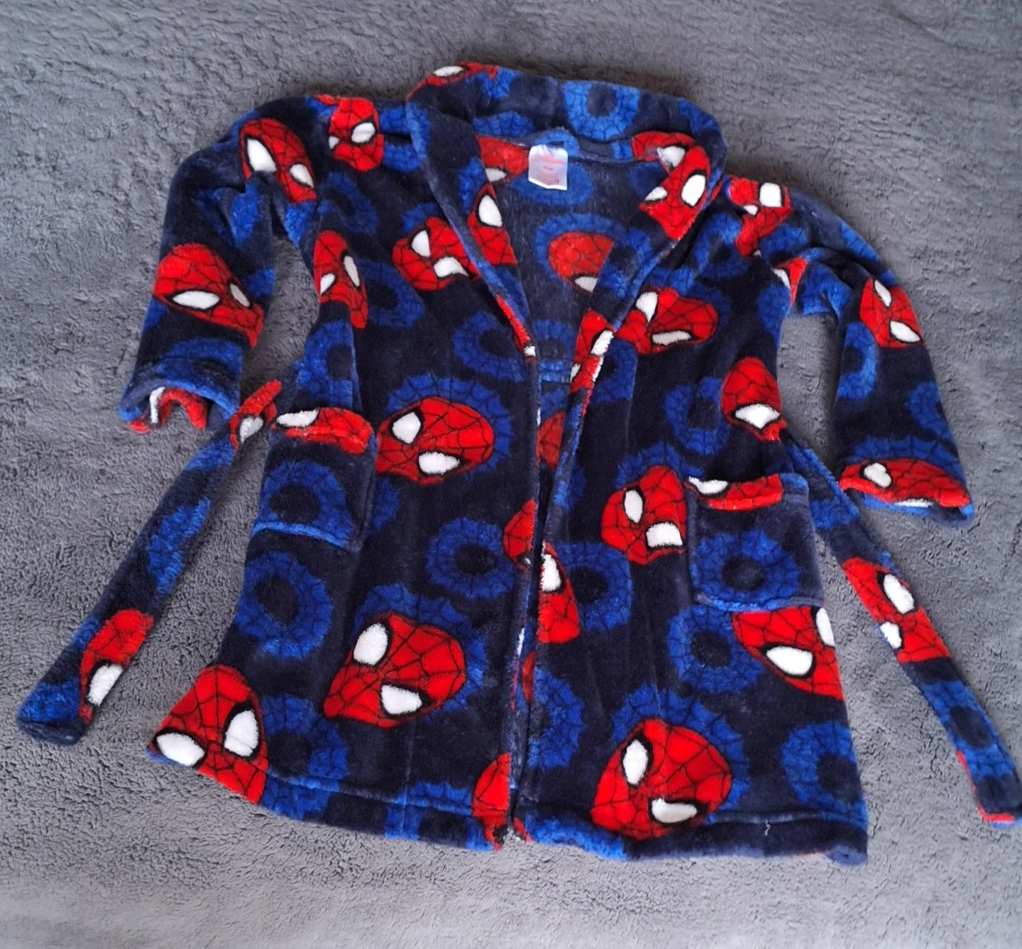 Selling a Marvel Spiderman bathrobe in size small (5/6). It's made of 100% polyester and features a fun Spiderman design. Perfect for keeping your little one warm after bath time!