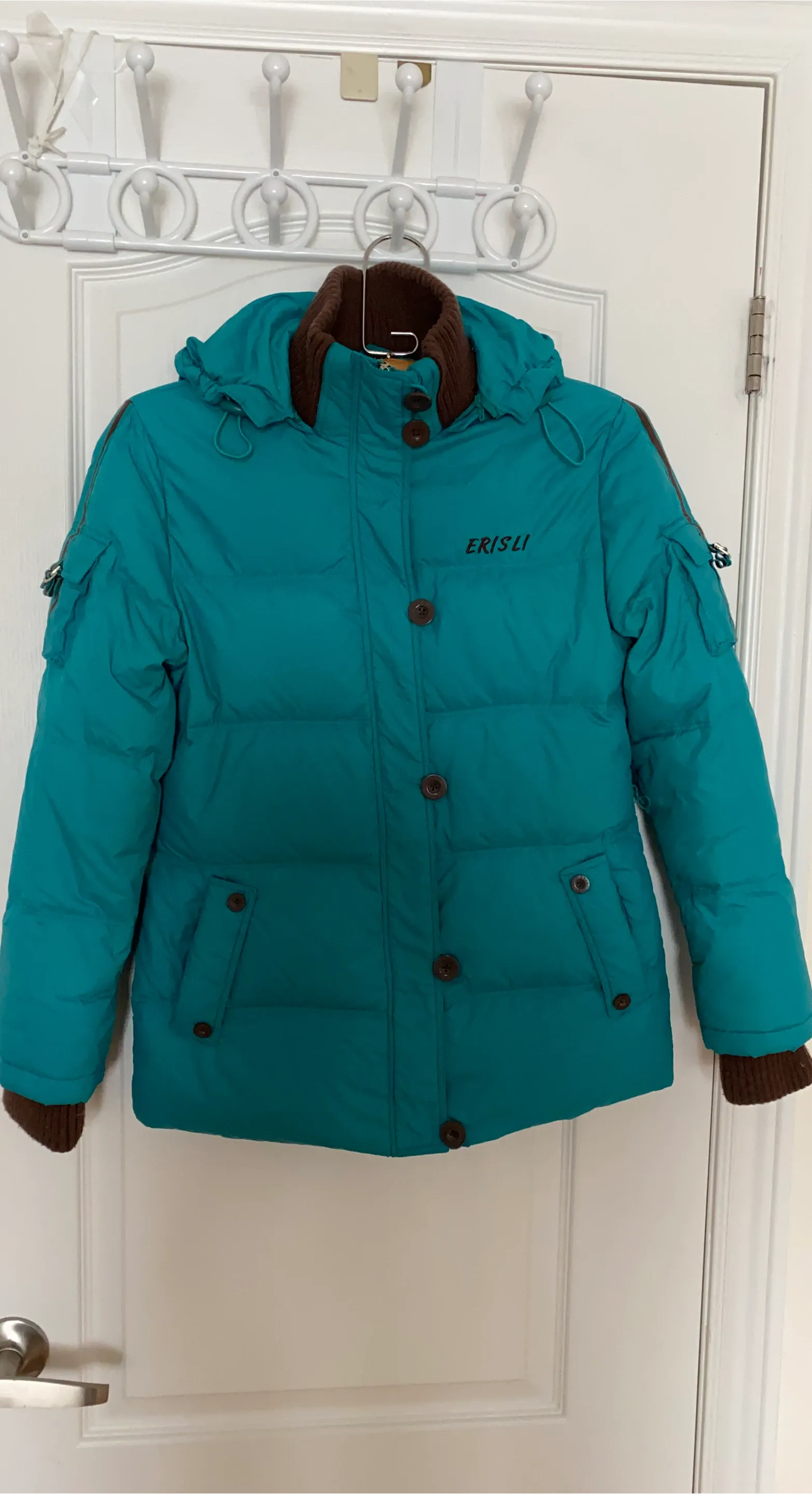 Here's a teal puffer jacket from Erisli! It has a brown ribbed collar and cuffs, and a button-up front. It's in great condition and ready for the colder weather