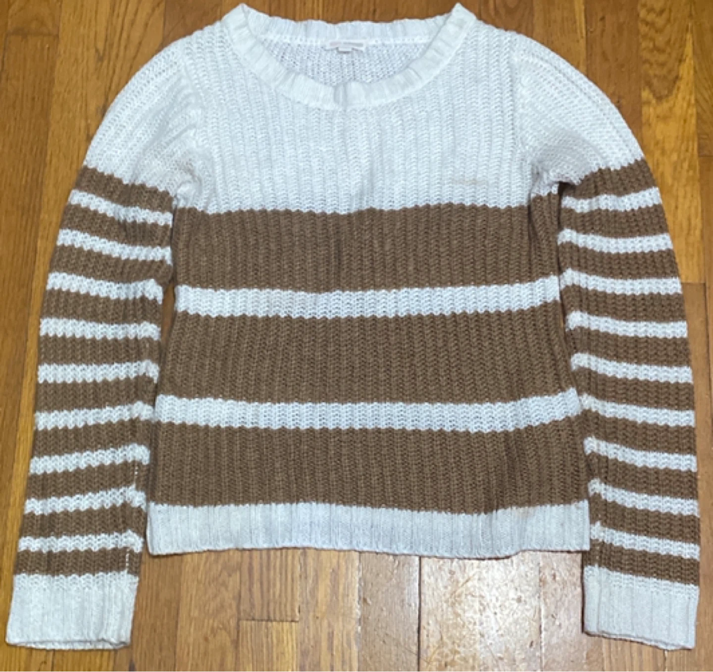 Here's a cozy Gap sweater with a striped design! It features a white top and brown stripes, perfect for a casual look. The material is soft and comfortable, making it great for everyday wear. It's in good condition and ready for a new home!