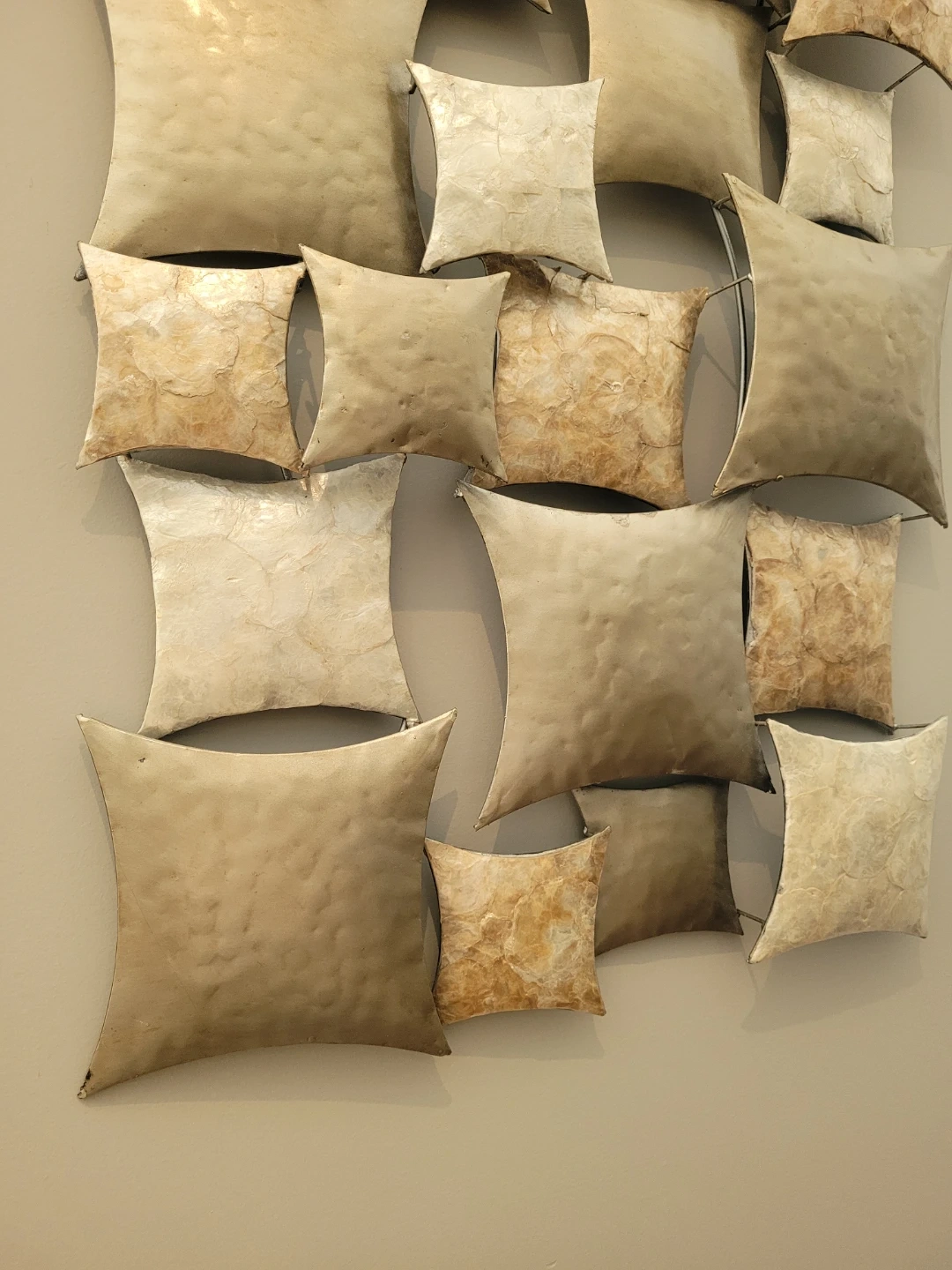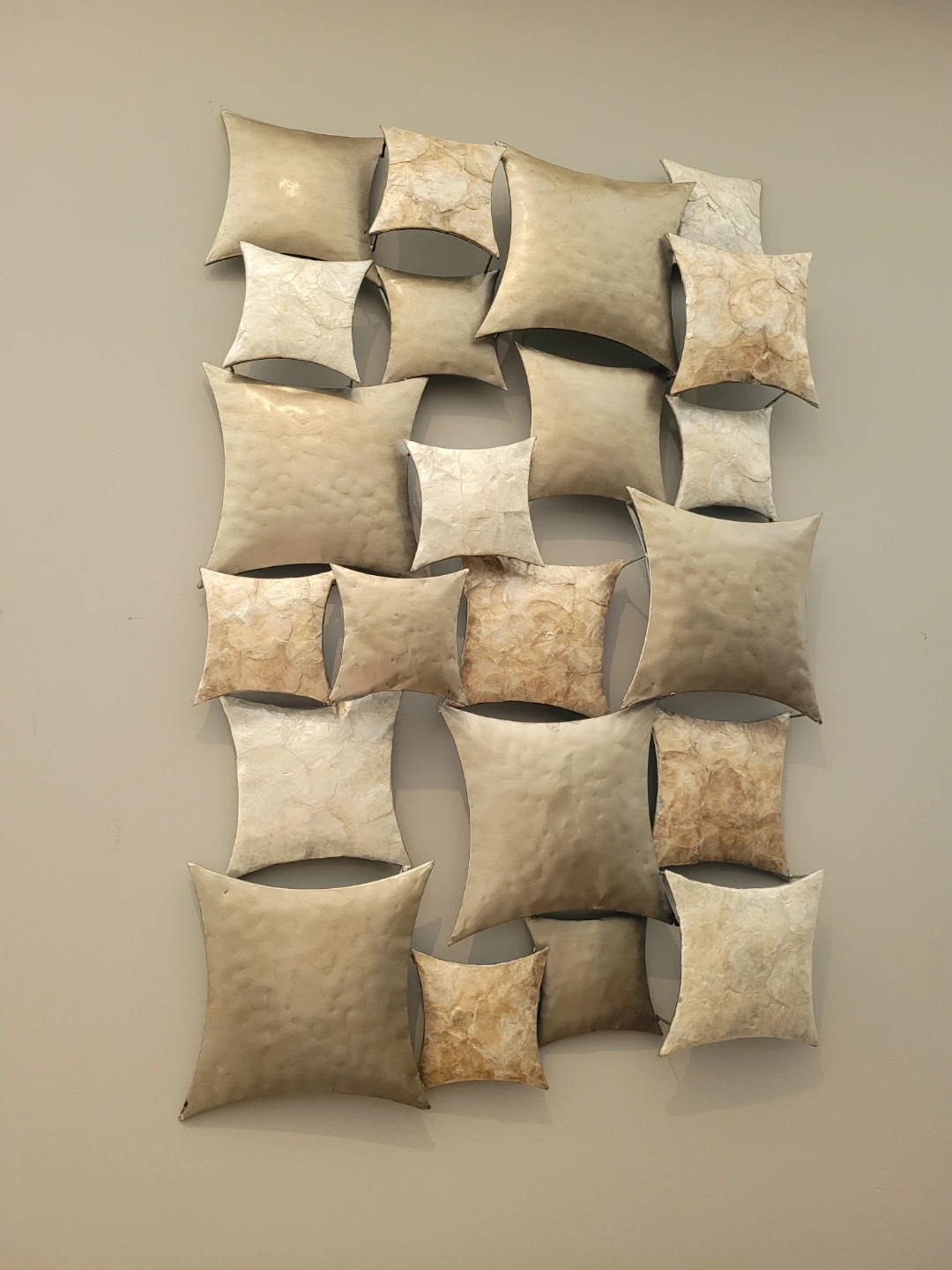 Unique metal wall decor featuring a pillow design. It adds a touch of modern art to any room. Great condition and ready to hang!