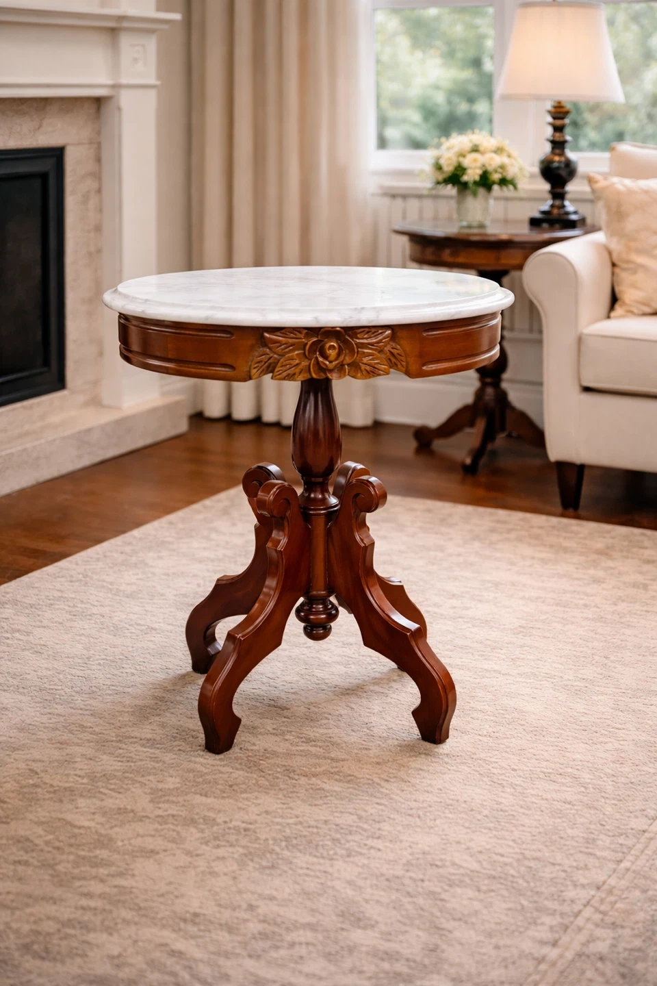 Here's a beautiful accent table with a marble top and a lovely carved rose detail! It has a classic, elegant look that would fit perfectly in a living room or entryway. It's in great condition and ready for a new home!