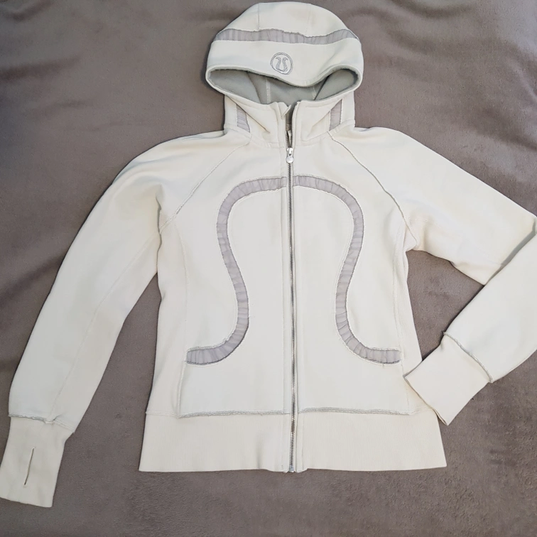 Lululemon Scuba Hoodie, specifically a special edition version known as the "Pleated Tape" style. The color is called Ghost, which is an off-white or light grey shade. D1/ 8