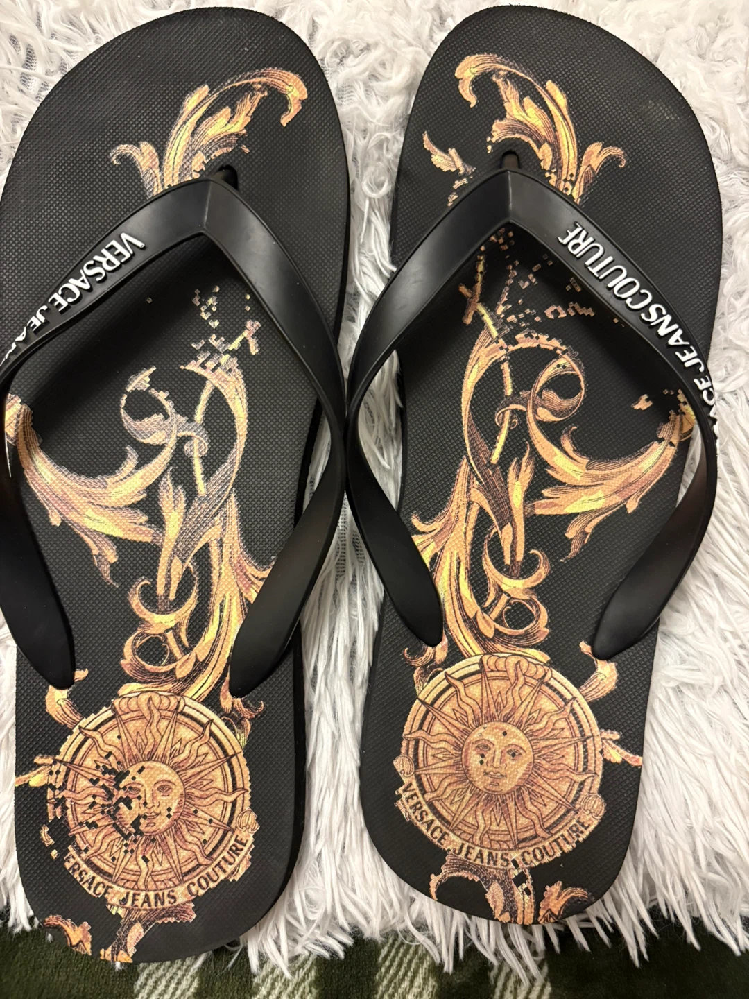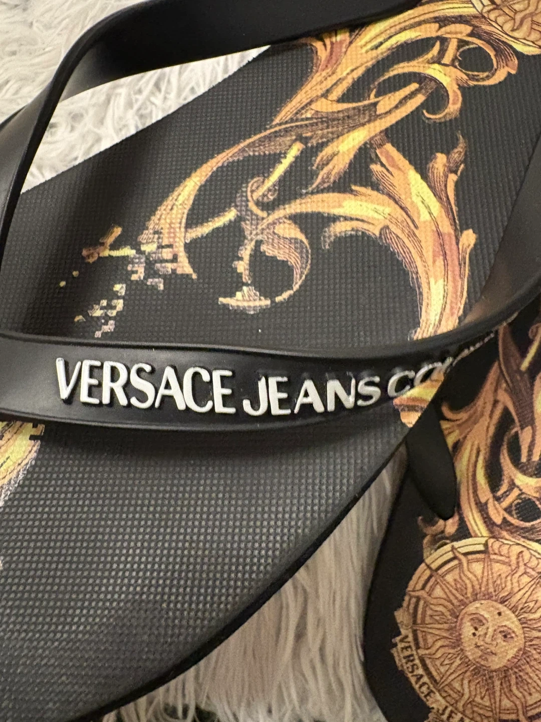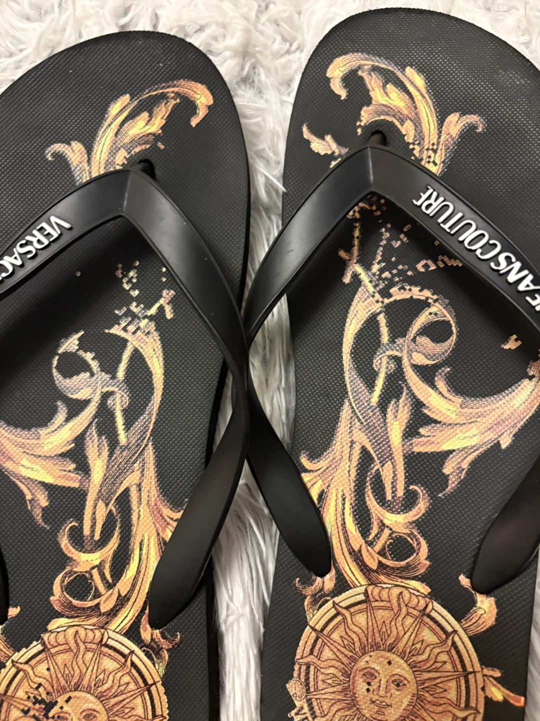 These Versace Jeans Couture flip flops are in great condition! They feature a black colour with a unique gold design. Perfect for summer days!