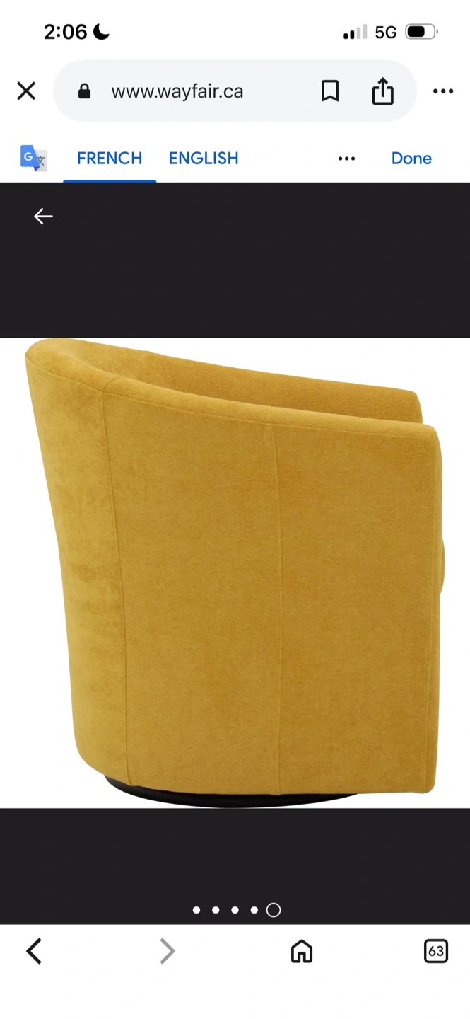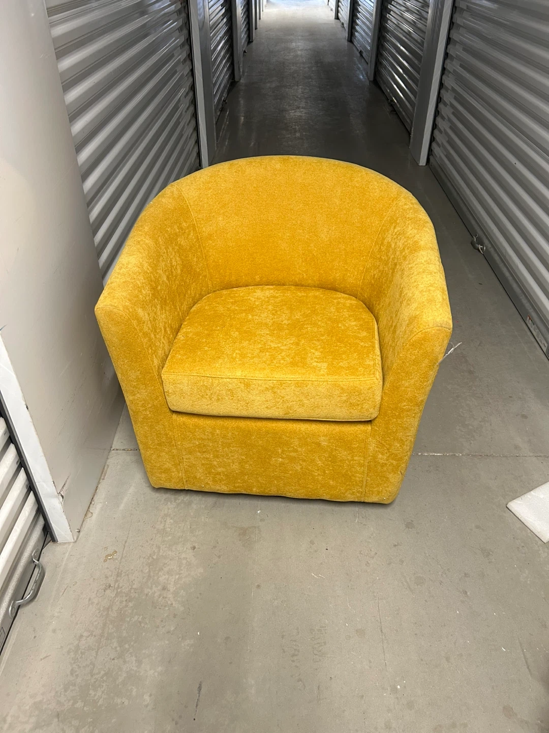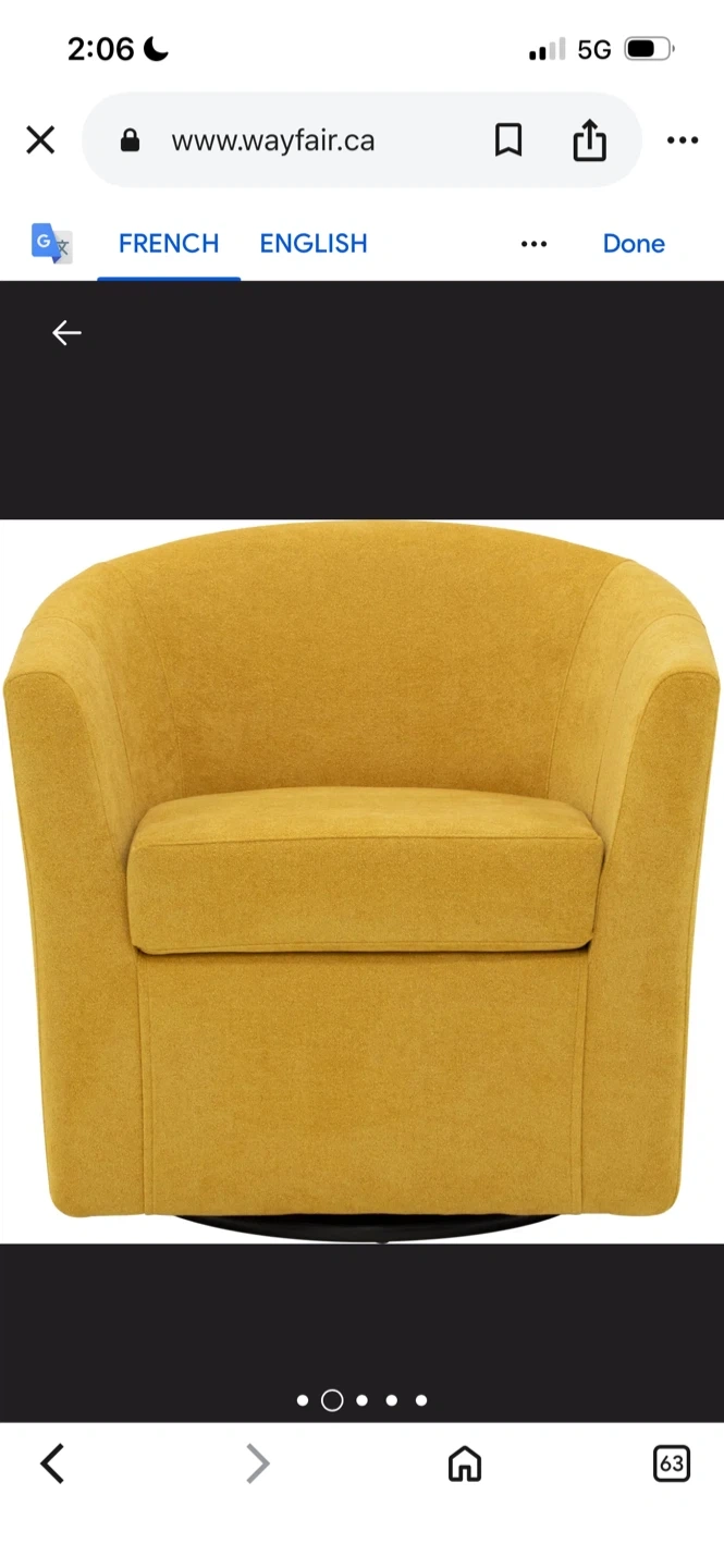 I'm selling a comfortable yellow swivel barrel accent chair! It would be a great addition to any living space. The chair features a swivel base for easy movement and is in great condition. The dimensions are approximately 30 inches in height, 27 inches in width, and 30.5 inches in depth