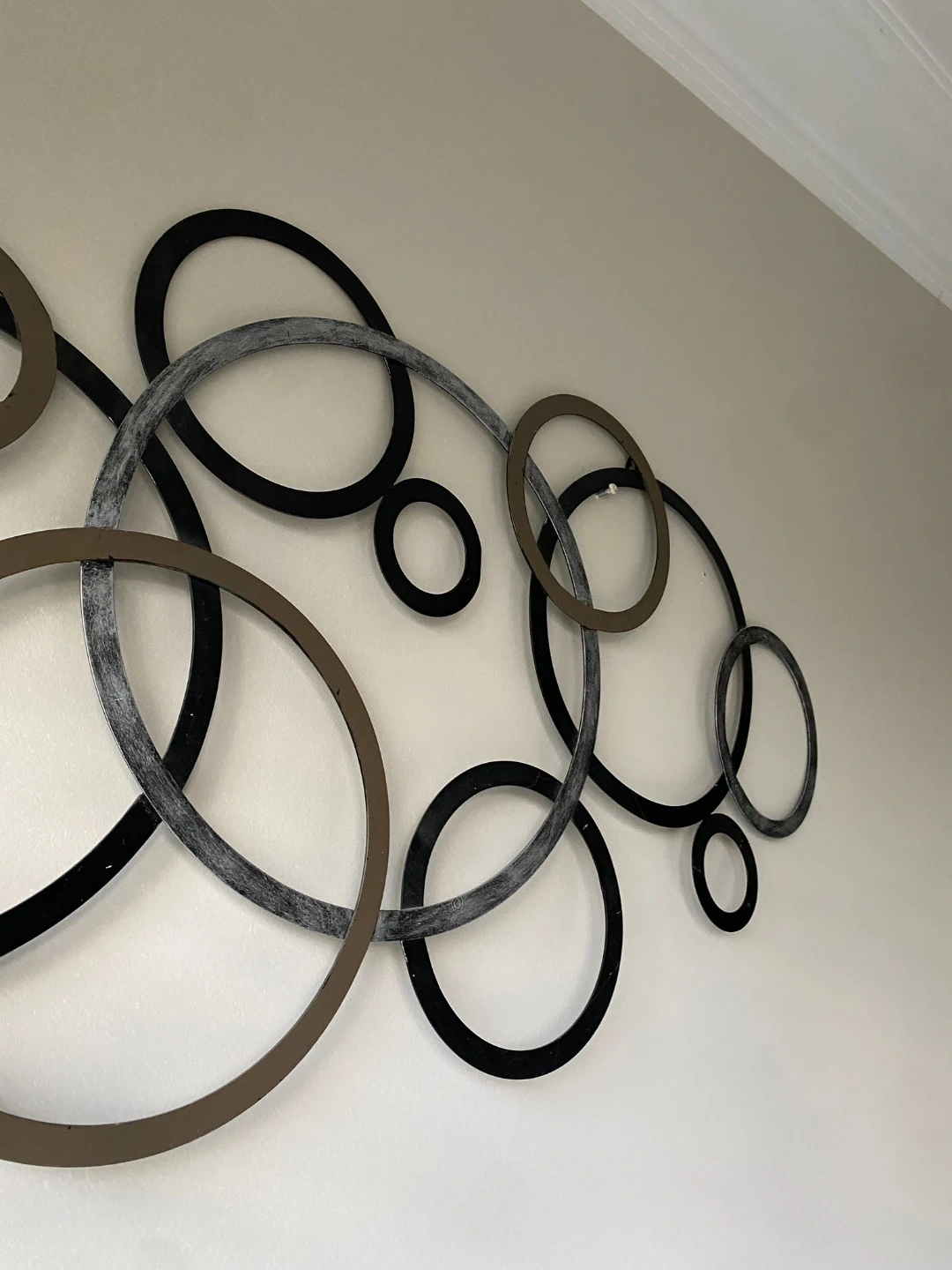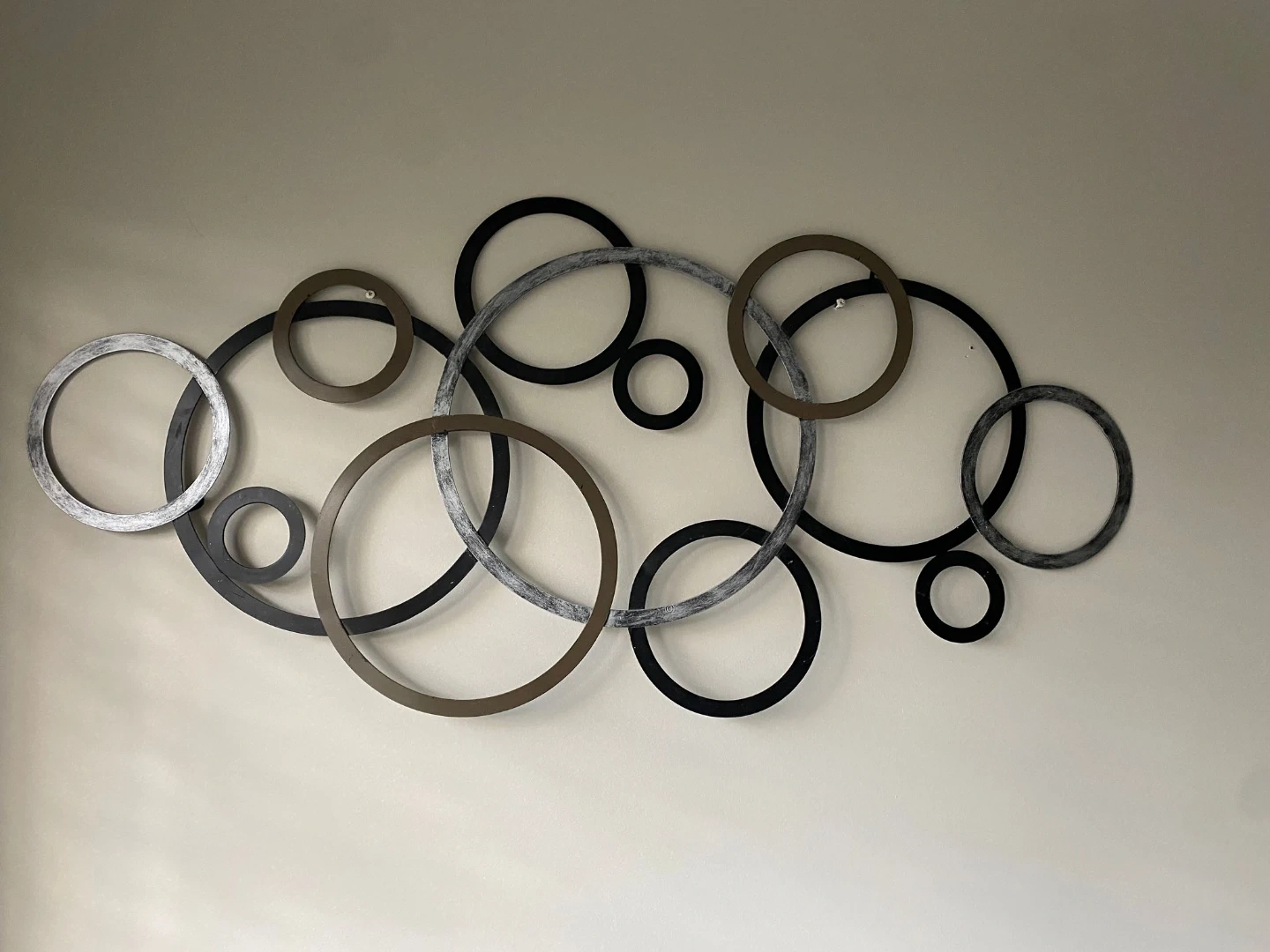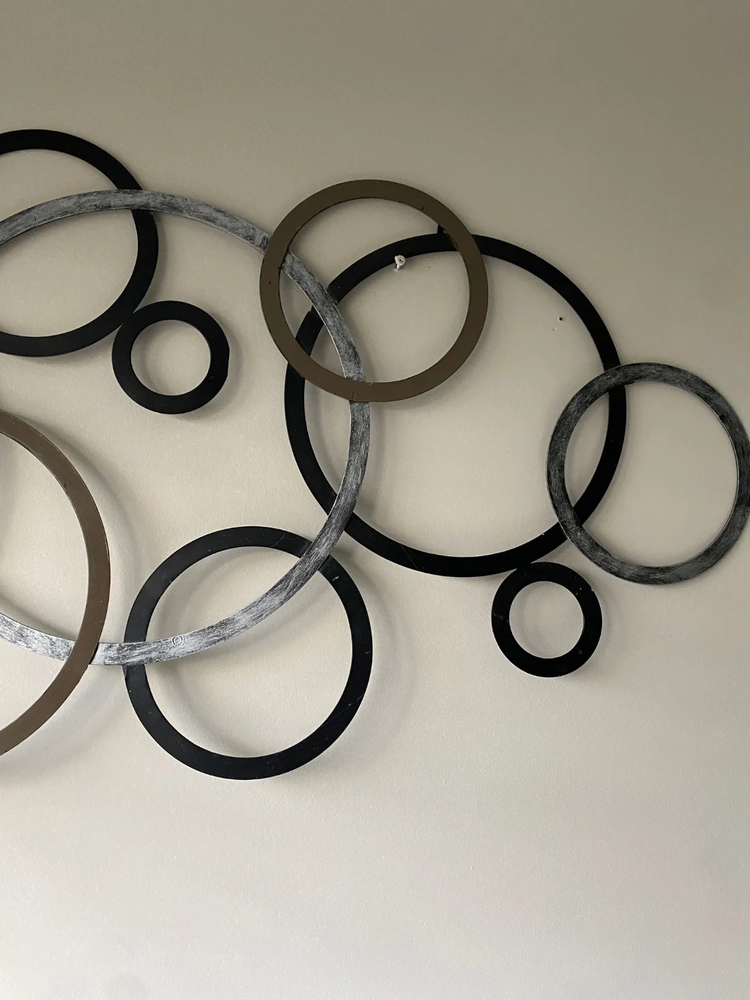 Add a modern touch to your home with this metal circle wall decor! It features interconnected circles in black, brown, and silver, creating a stylish and eye-catching design. Perfect for any room!