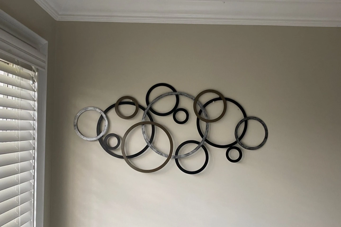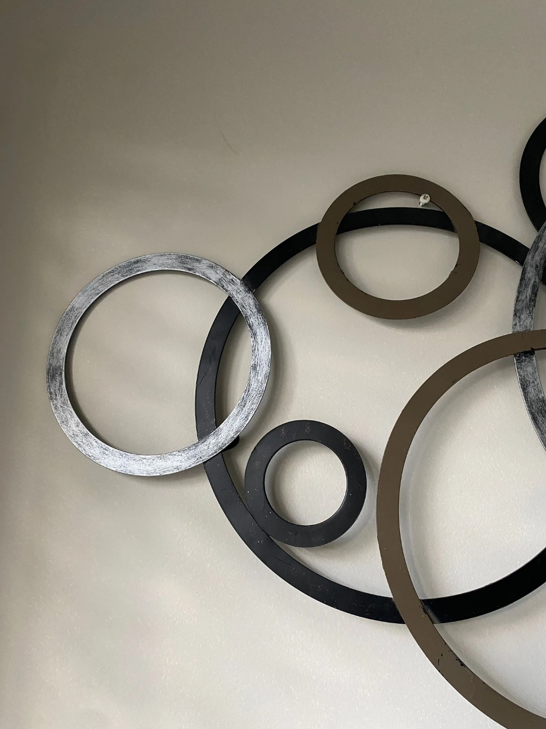 Add a modern touch to your home with this metal circle wall decor! It features interconnected circles in black, brown, and silver, creating a stylish and eye-catching design. Perfect for any room!