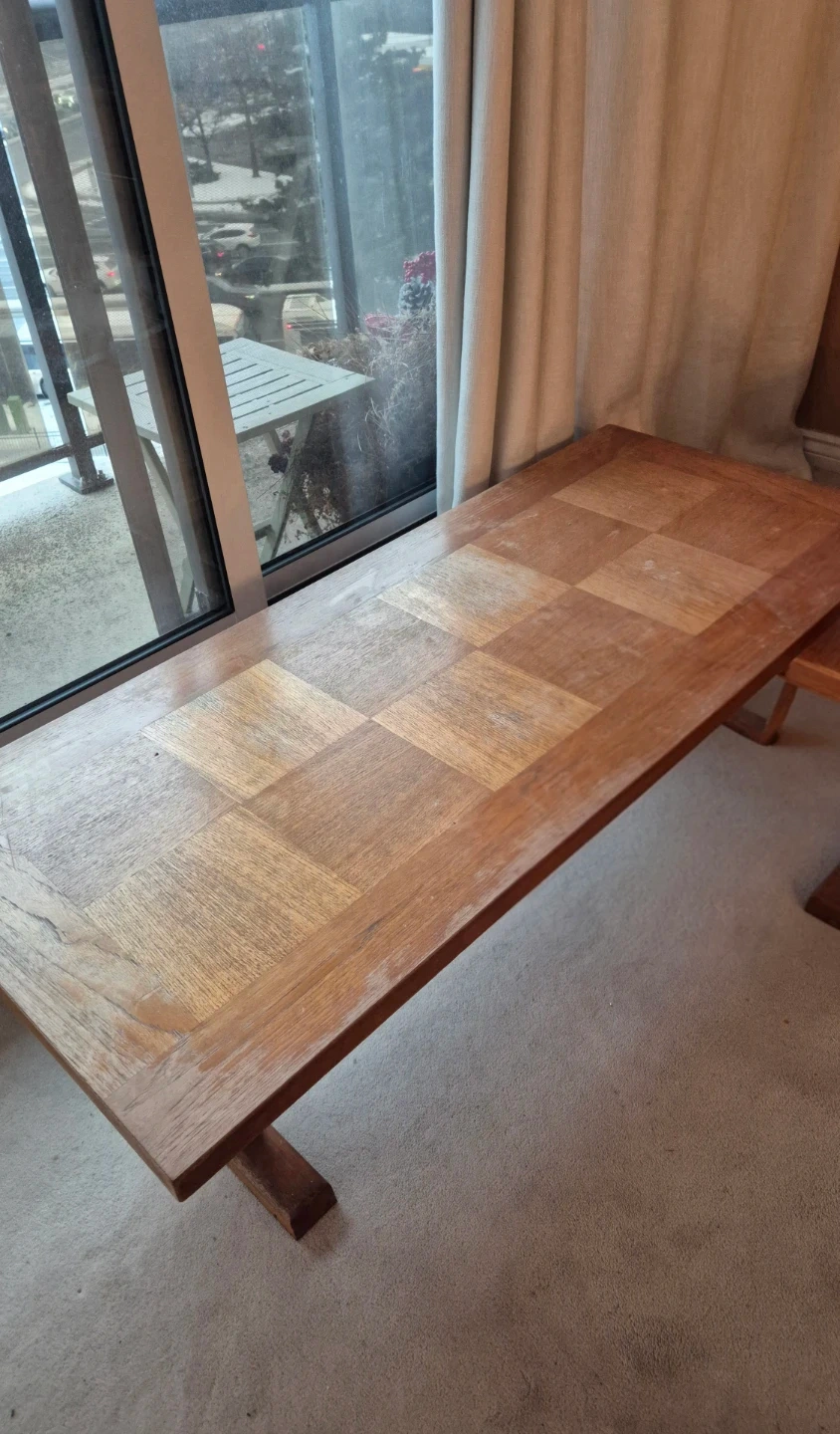 Buy & SellTeak Coffee Table and side table.Teak Coffee Table and side table.$50Selling a vintage wooden coffee table. It has a unique checkered pattern on the top surface and a sturdy base. Needs refurbished. ConditionOkayWHERE TO MEETCondoView MapSELLERverifiedAlWestney And Kingston1435 reviews0 chats·0 favorites·56 viewsSEND CHAT TO SELLERHi Al! I’m interested in your listing.Hi Al! I’m interested in your listing.Get the Karrot app to chatSign In to chat