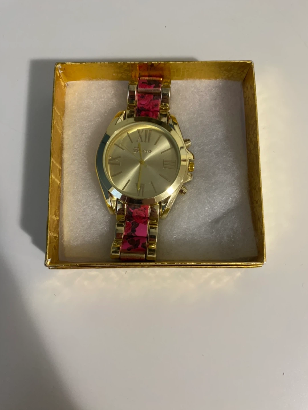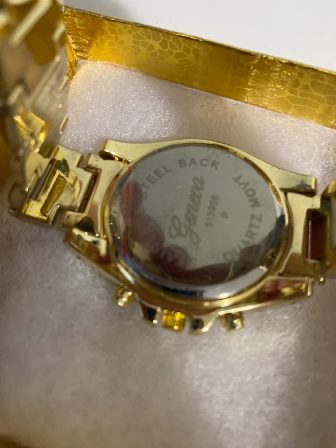 Selling a lovely Geneva watch! It features a gold-tone finish with a beautiful floral design on the band. It still has tape on the inside of the watch. Needs a battery change but it is brand new, never worn.