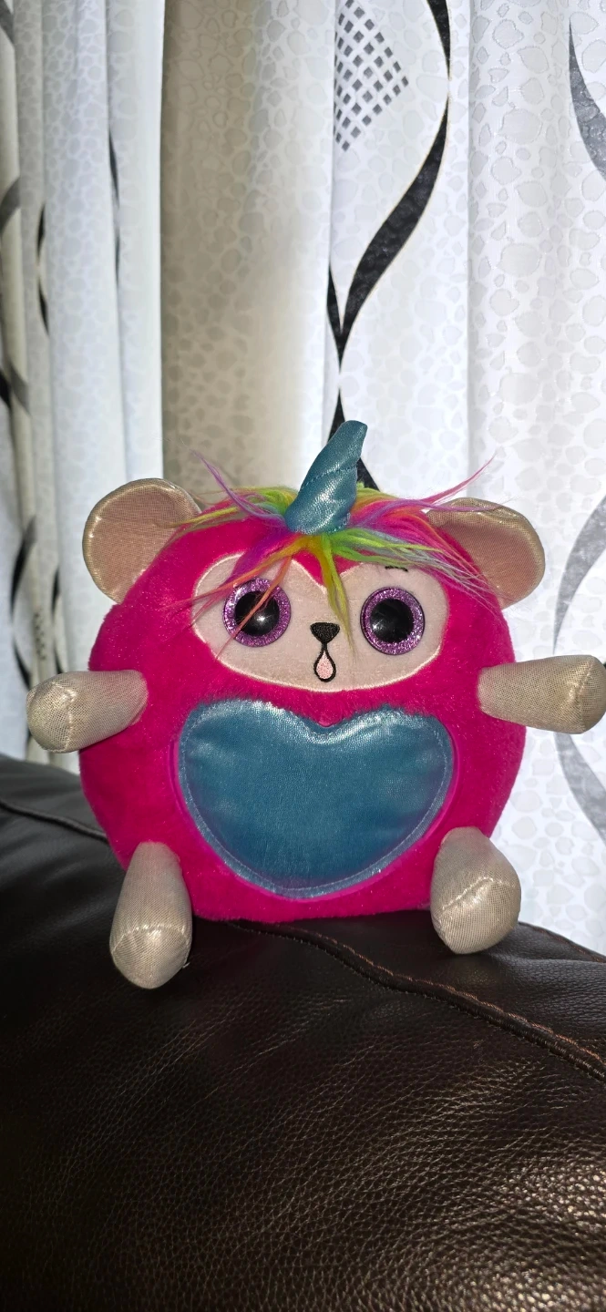 A cute pink plush toy with a butterfly design is up for grabs! It's in great shape and ready for a new home. The toy has a soft, fuzzy texture and features a purple butterfly accent. It's a fun and cuddly friend!