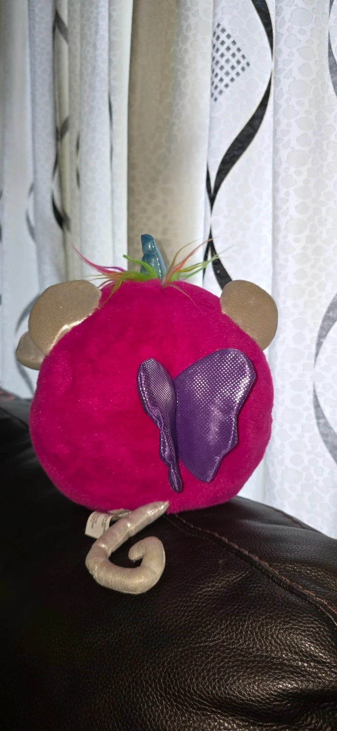 A cute pink plush toy with a butterfly design is up for grabs! It's in great shape and ready for a new home. The toy has a soft, fuzzy texture and features a purple butterfly accent. It's a fun and cuddly friend!