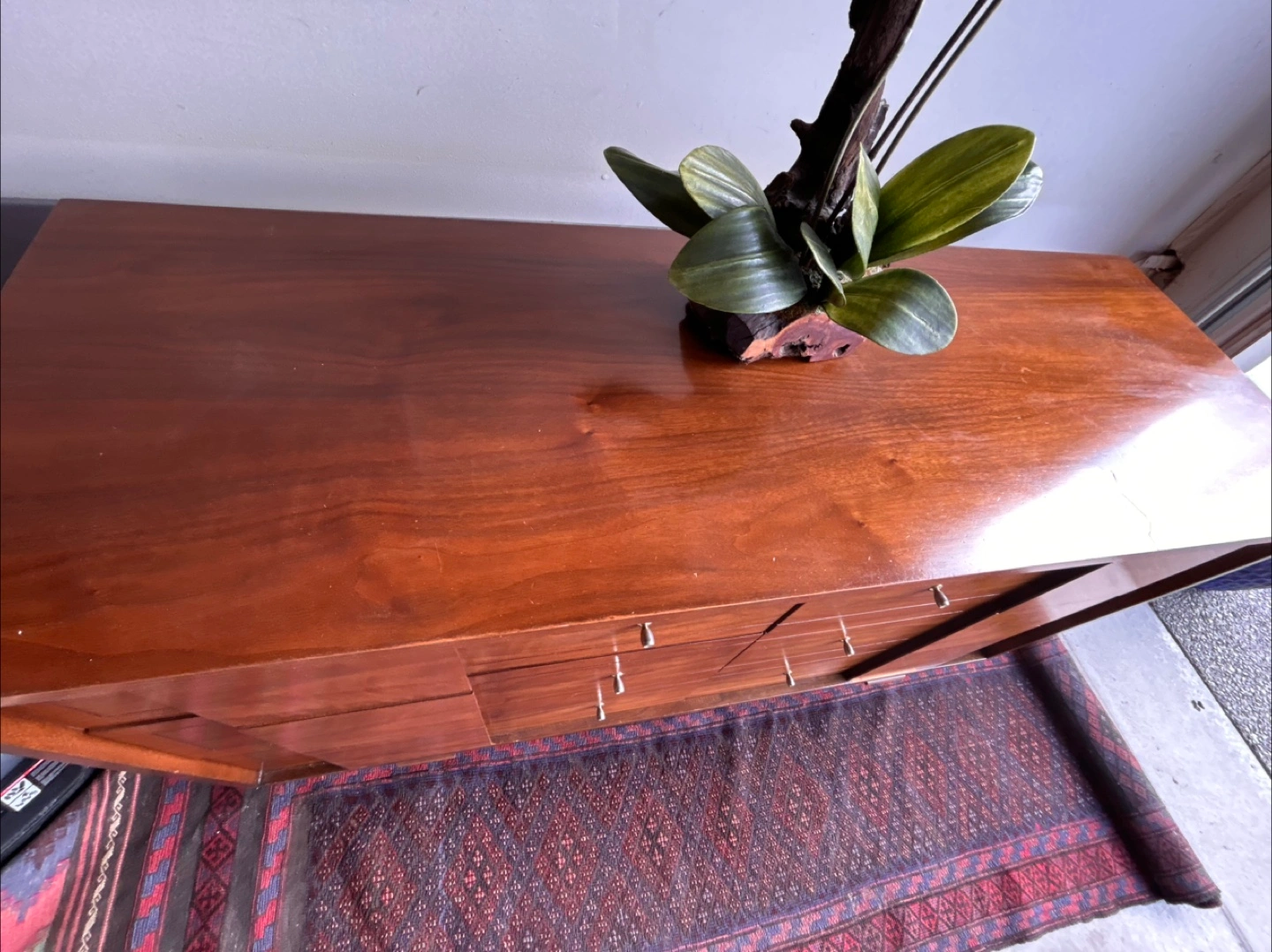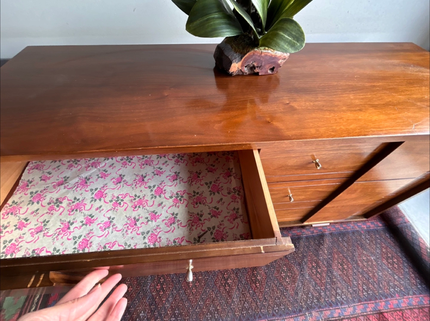 Here's a lovely mid-century modern wood dresser with a warm, inviting tone. It features multiple drawers, perfect for organizing your belongings. A great addition to any bedroom or living space!