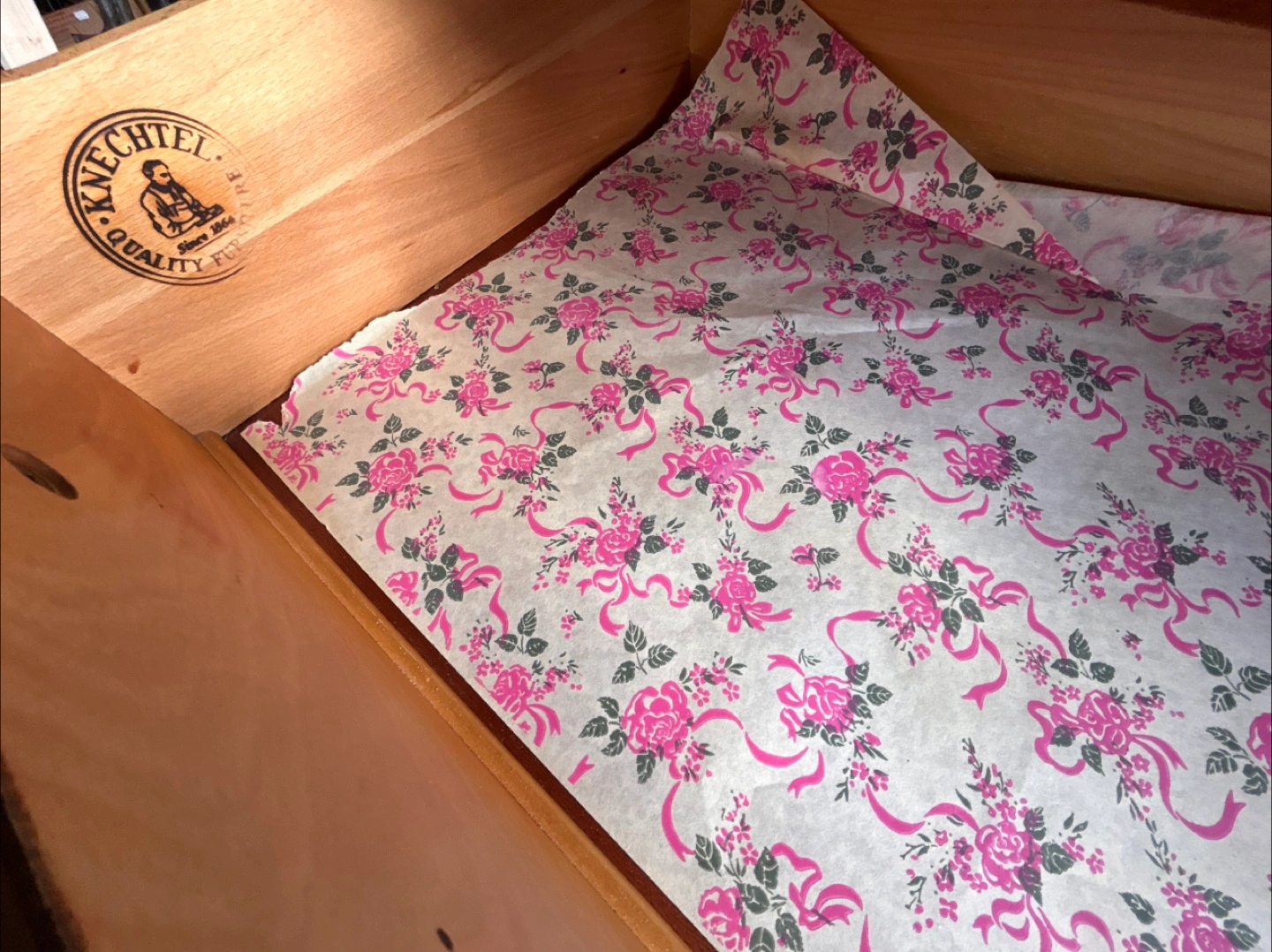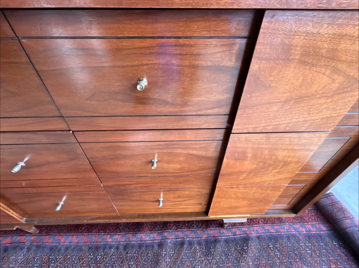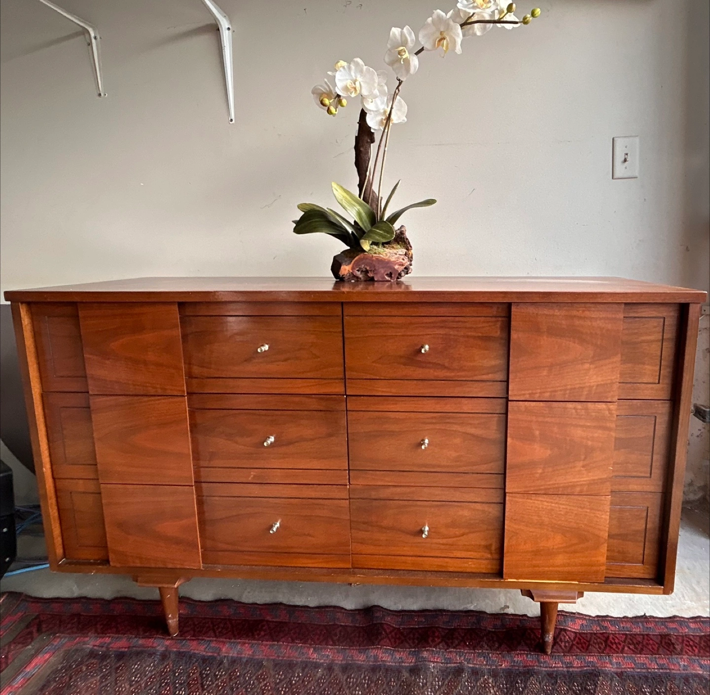Here's a lovely mid-century modern wood dresser with a warm, inviting tone. It features multiple drawers, perfect for organizing your belongings. A great addition to any bedroom or living space!