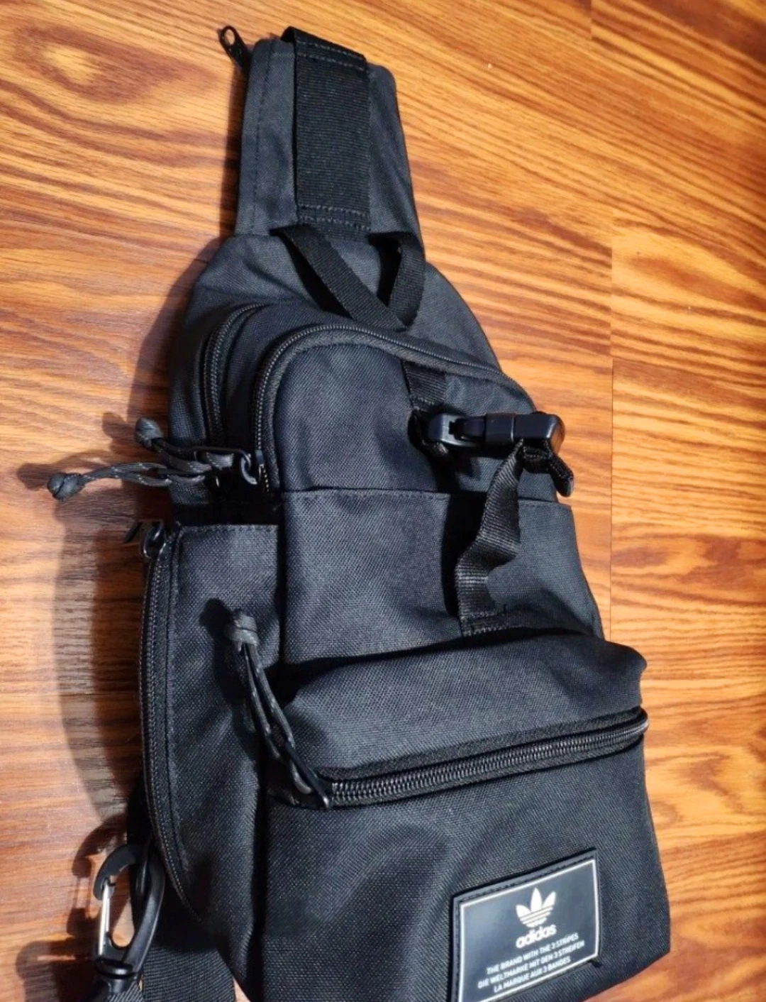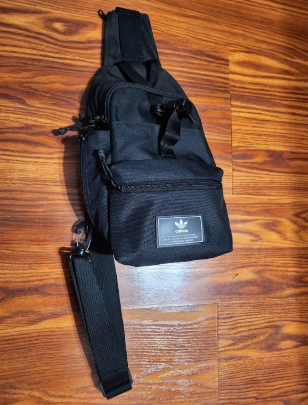 This is a stylish black Adidas sling bag. It's perfect for carrying your essentials while keeping your hands free. The bag features multiple compartments for organization and an adjustable strap for a comfortable fit. Great for everyday use or travel!