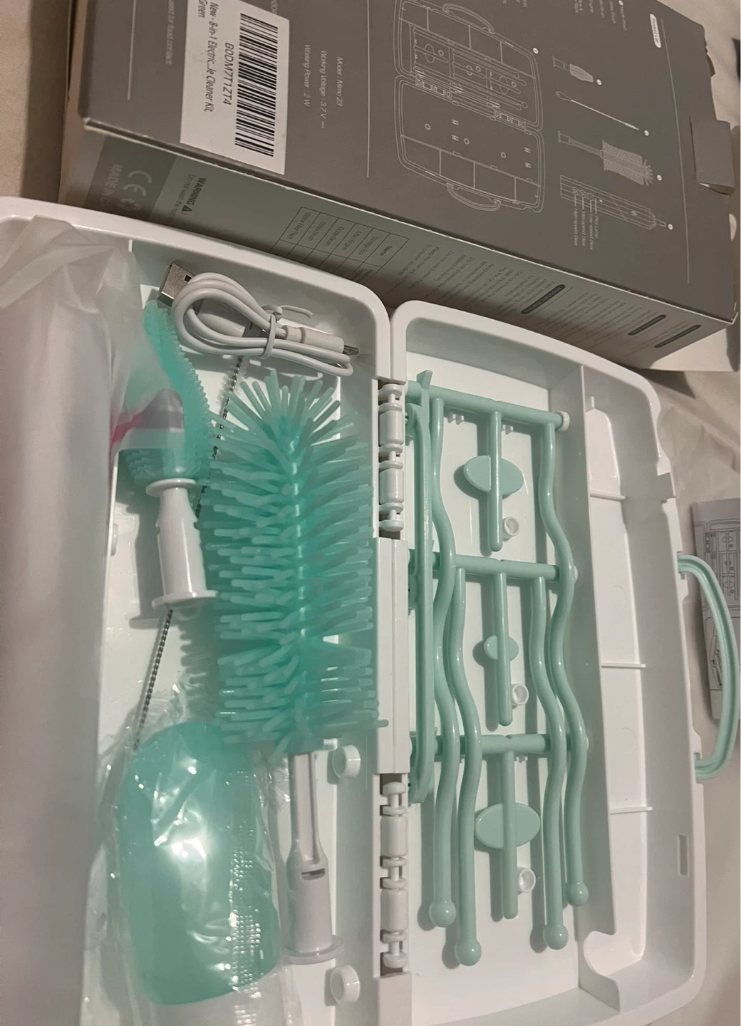 This 8-in-1 electric baby bottle brush set is perfect for keeping your little one's bottles clean! It comes with a drying rack, straw brush, nipple brush, soap dispenser, electric handle, USB-C cable, and a storage box. The long-lasting battery and 3-speed control make cleaning a breeze. Great for any parent!