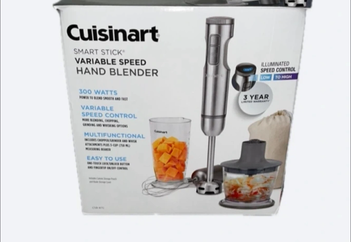Selling a Cuisinart Smart Stick Variable Speed Hand Blender. This hand blender has 300 watts of power to blend smoothly and quickly. It features variable speed control for blending, chopping, grinding, and whisking. It's multifunctional and includes a chopper/grinder, whisk attachments, and a 3-cup (750 mL) measuring beaker. Easy to use with one-touch lock/unlock button and fingertip on/off control.